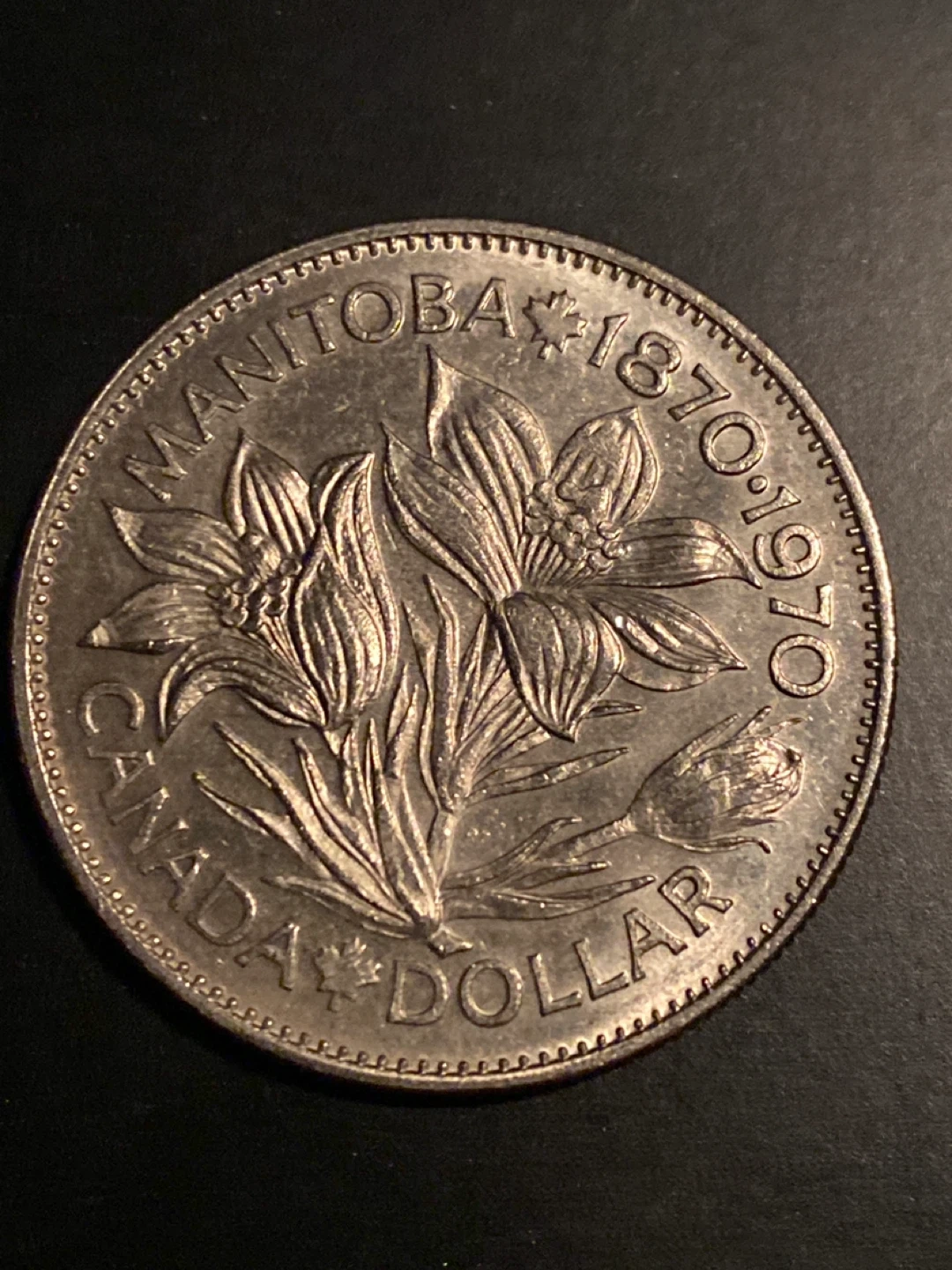 This is a 1970 Canadian dollar coin celebrating Manitoba's centennial. It features the provincial flower on one side and Queen Elizabeth II on the other. This coin is a great addition for collectors.