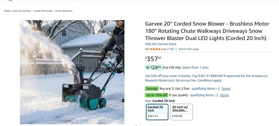 Tackle heavy snow with ease using this 20" corded snow blower. It features a powerful 40V brushless motor that clears a 20-inch path and cuts through up to 12-inch depths. The 180-degree rotating chute lets you direct snow up to 25 feet away. Dual LED headlights are great for clearing snow in early mornings or late evenings. Comes with two 20V lithium batteries for extended runtime, enough to clear a 6-8 car driveway on a single charge. Let me know if you're interested!