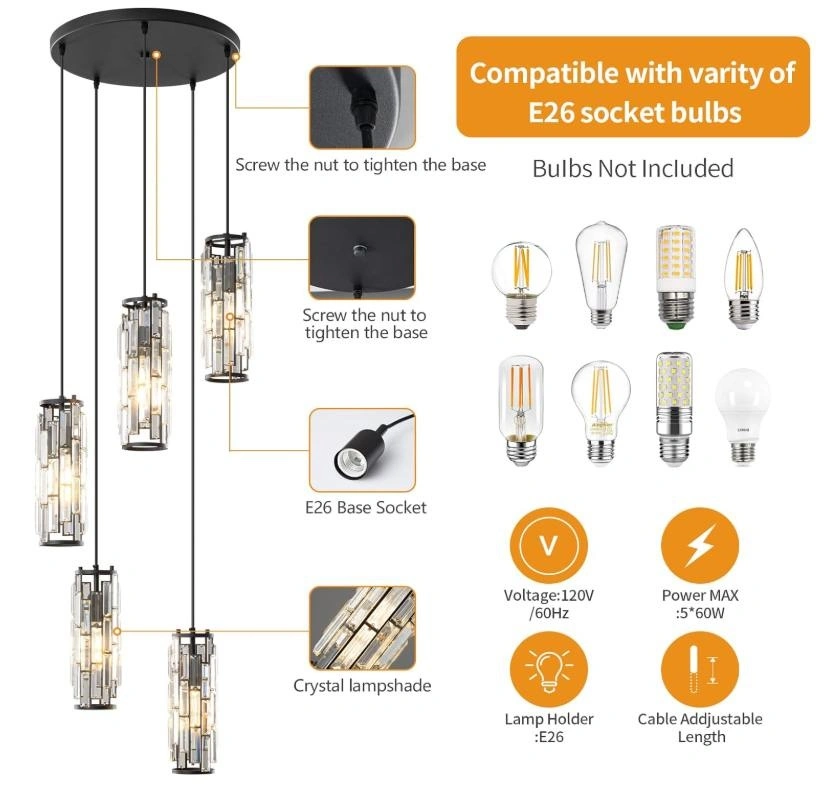 LMQNINE Pendant Light, Black Modern Pendant Light Fixtures, Mini Crystal Chandeliers, Adjustable 5-Light Pendant Lighting for Kitchen Island Dinning Room Bedroom (Black 5-Light). This inspired design - The perfect combination of black finish metal and crystal brings charming retro and modern industrial charm, which matches most furniture styles and adds beautiful decoration to your home.