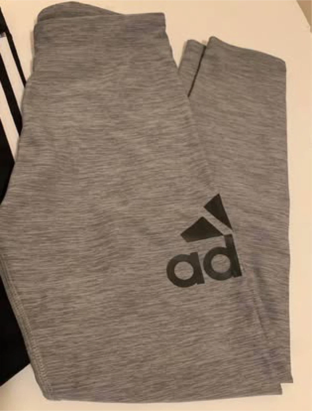 Two pairs of Adidas girl's leggings in black and grey, size medium. The black pair features white stripes and logo. The grey pair has a large brand logo. Both are made with a polyester and elastane blend for comfort and stretch. Made in Vietnam from 100% recycled yarns for the labels. Super comfy for active days or just chilling. No rips or stains.