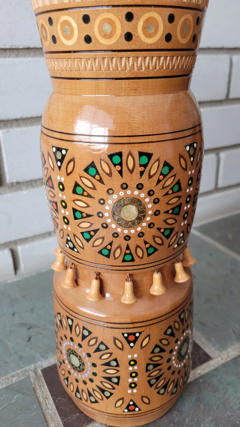 Handcrafted vase with delicate inlay patterns of wood, mother of pearl and seed beads. By artisans in the Carpathian mountains.