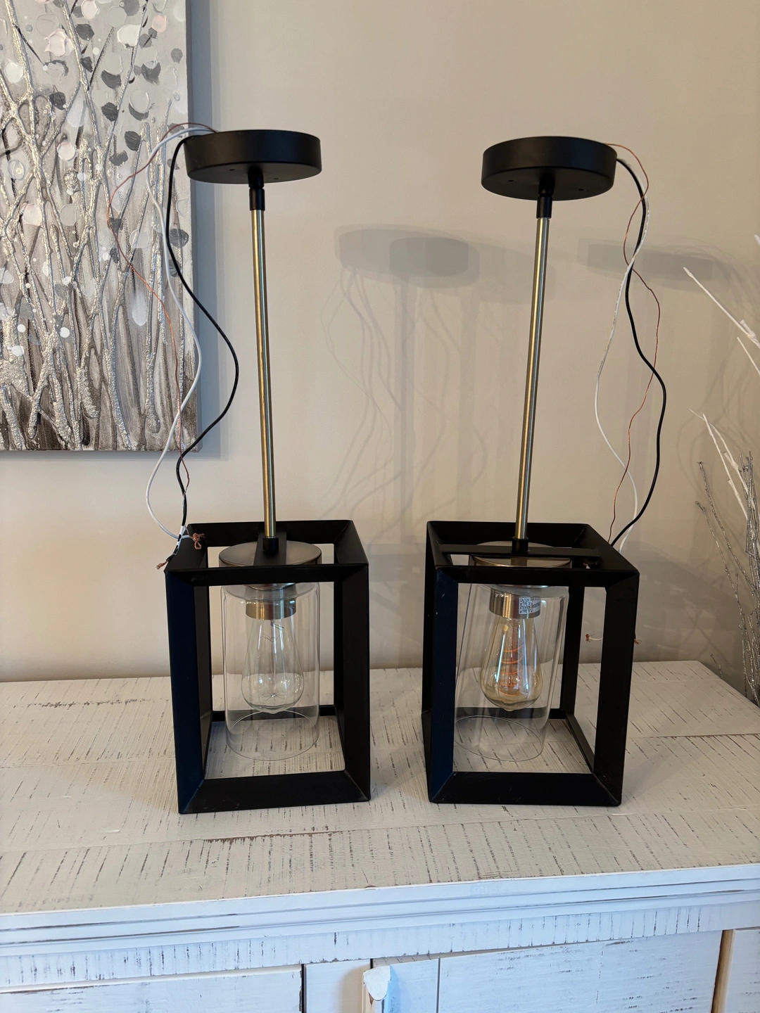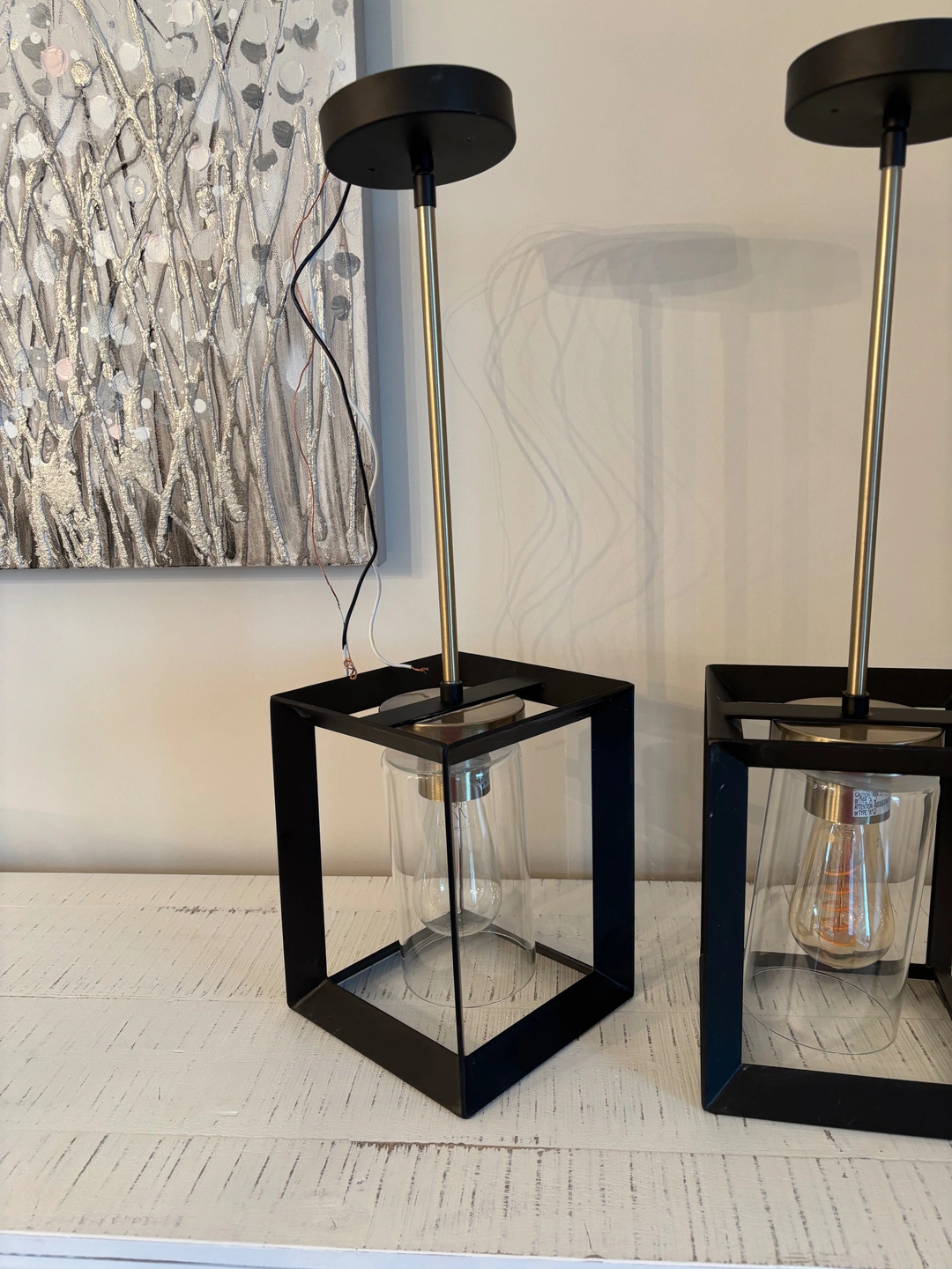 Beautiful,solid, well made - black metal pendant lights, lantern style. Light is surrounded by glass.
