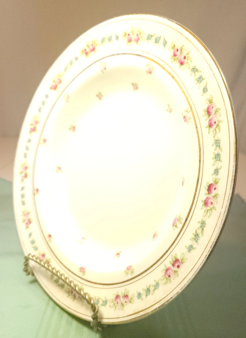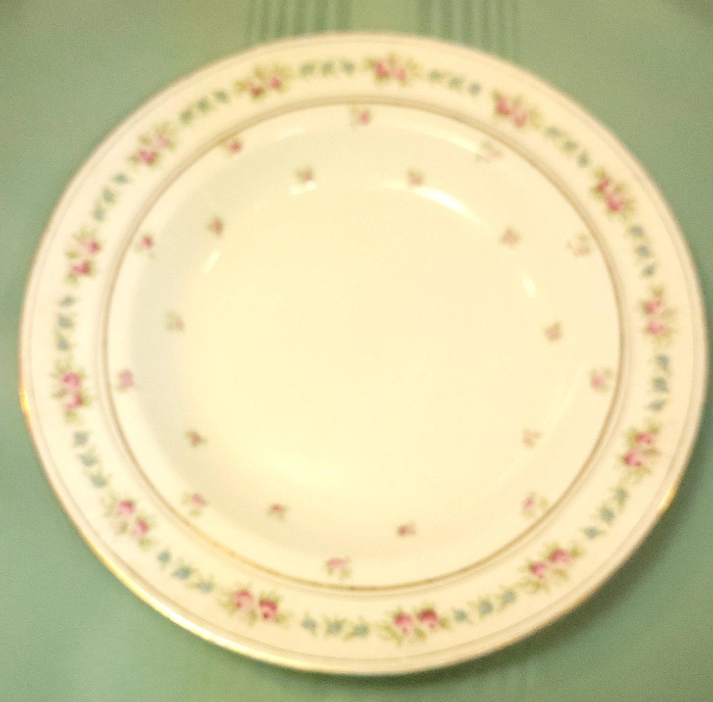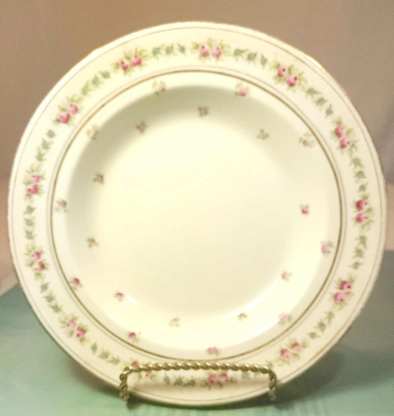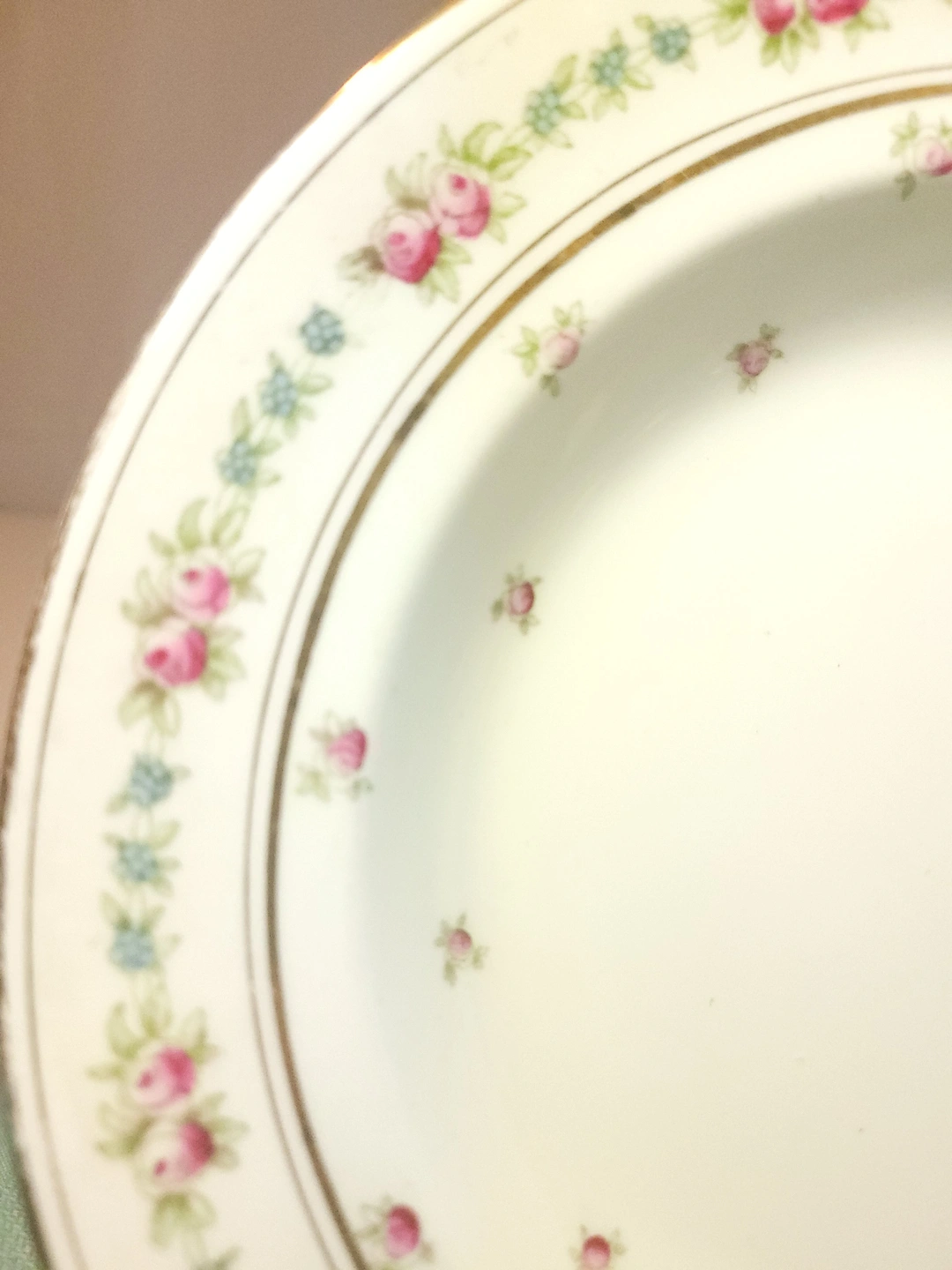 Stunning antique rimmed bowl (soup/pasta style) by Bishop & Stonier, one of the premier Staffordshire potteries of the Edwardian era. This piece features a delicate transferware pattern of soft pink rose clusters, small blue accent blossoms, and detailed green foliage on a crisp white semi-porcelain body. The rim is gently scalloped with an elegant, lightly weathered gold-gilt edge.