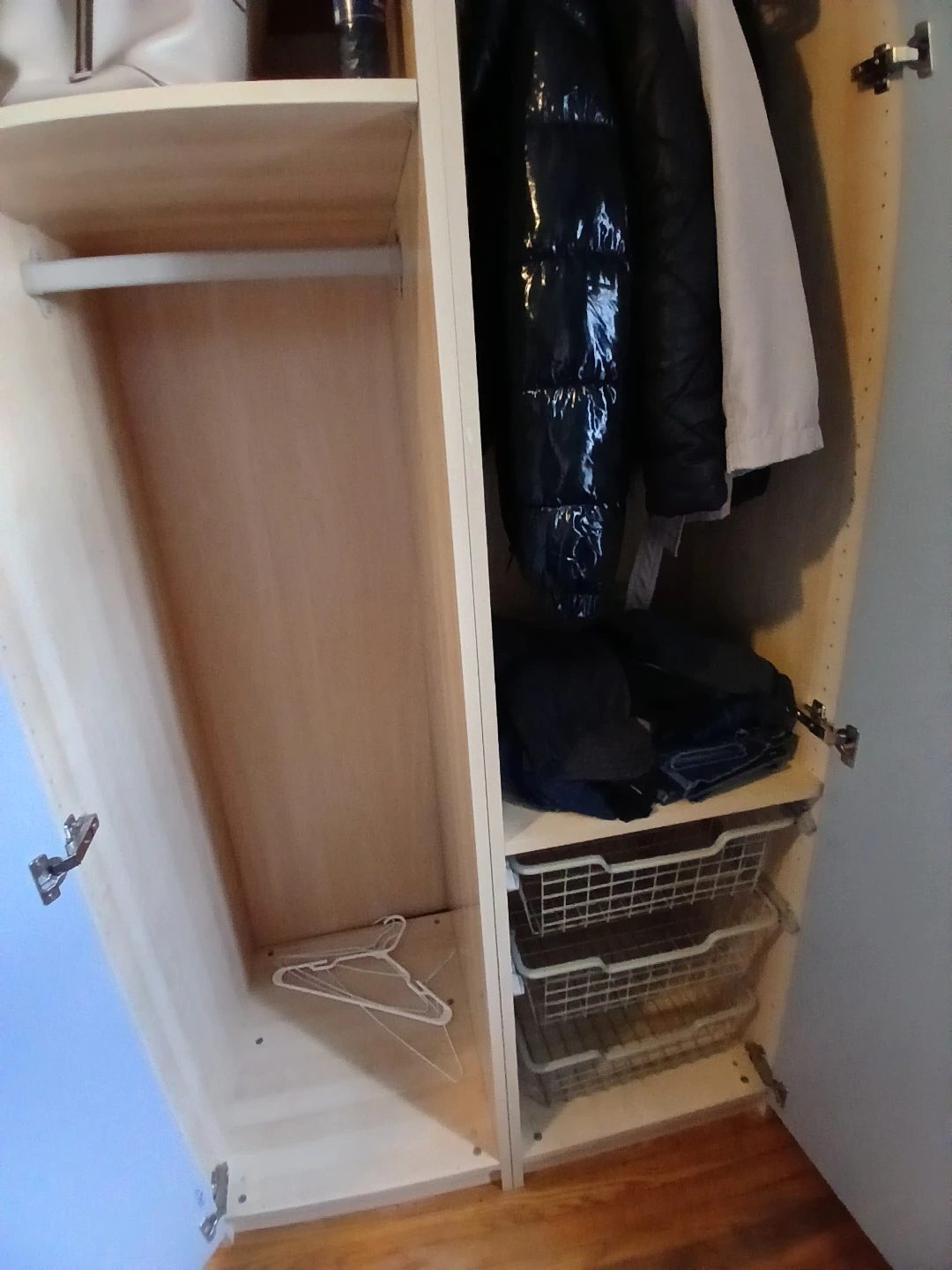 In excellent condition. Light wood colour with mirror on door. Comes with hanging bar and shelves/drawers seen in photo.