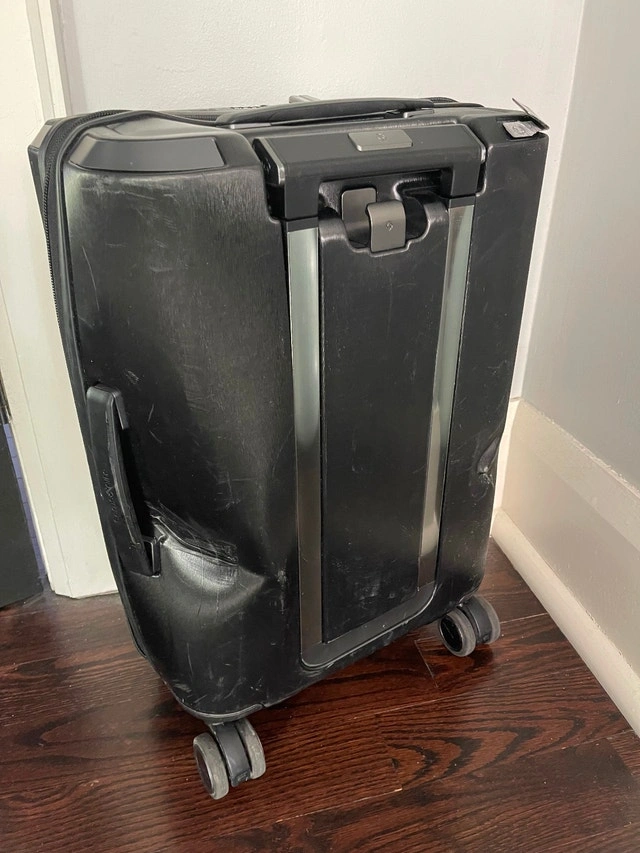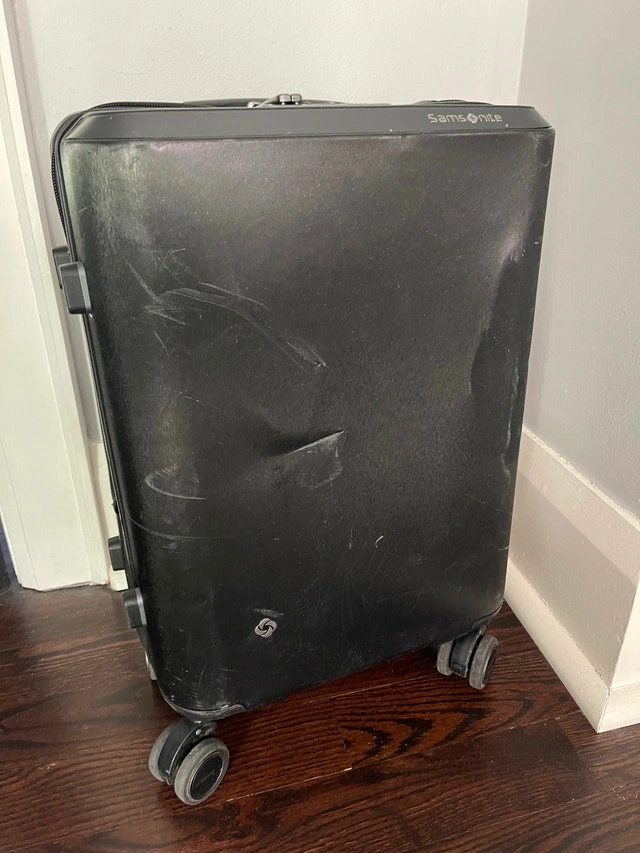 Unfortunately, the airlines caused some superficial damage on its last trip: scratches on the front, a dent on the back, and a metal decorative piece on top that needs to be glued down. Please see photos for reference.
