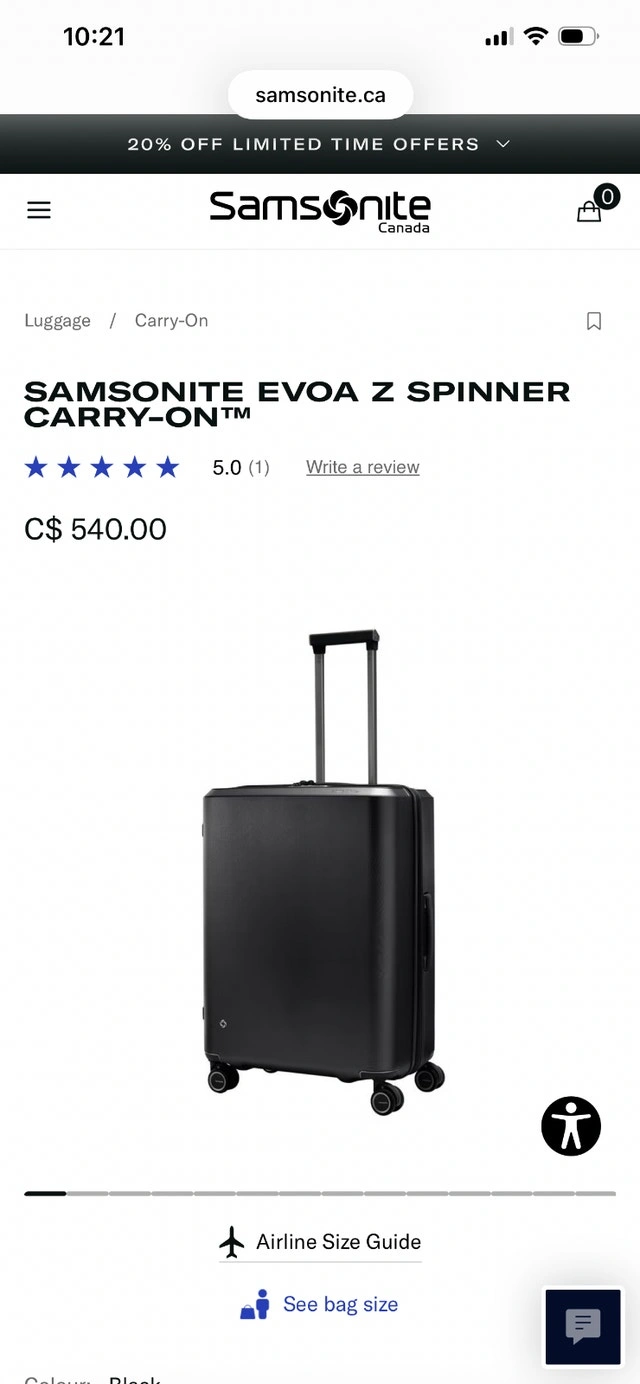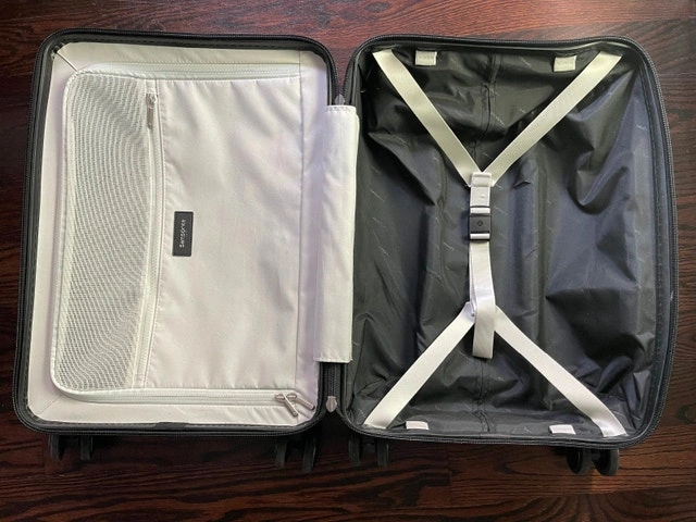 Selling an authentic Samsonite Evoa Z Spinner Carry-On suitcase in black. Purchased one year ago and used only a few times.