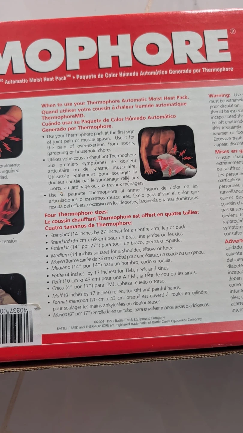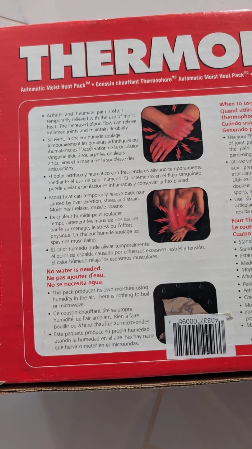 This automatic moist heat pack offers temporary relief for arthritis and rheumatic pain. It's designed to relieve back pain caused by over-exertion, stress, and strain. It provides deep moist heat for sore muscles.