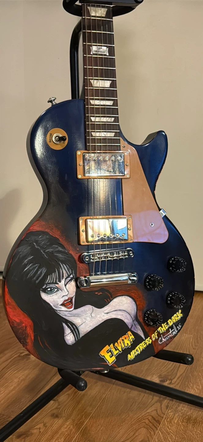 This is a Gibson Les Paul Studio electric guitar, celebrating the 120th anniversary. It features a custom Elvira "Mistress of the Dark" artwork on the body. Comes with a strap, cable, and picks.