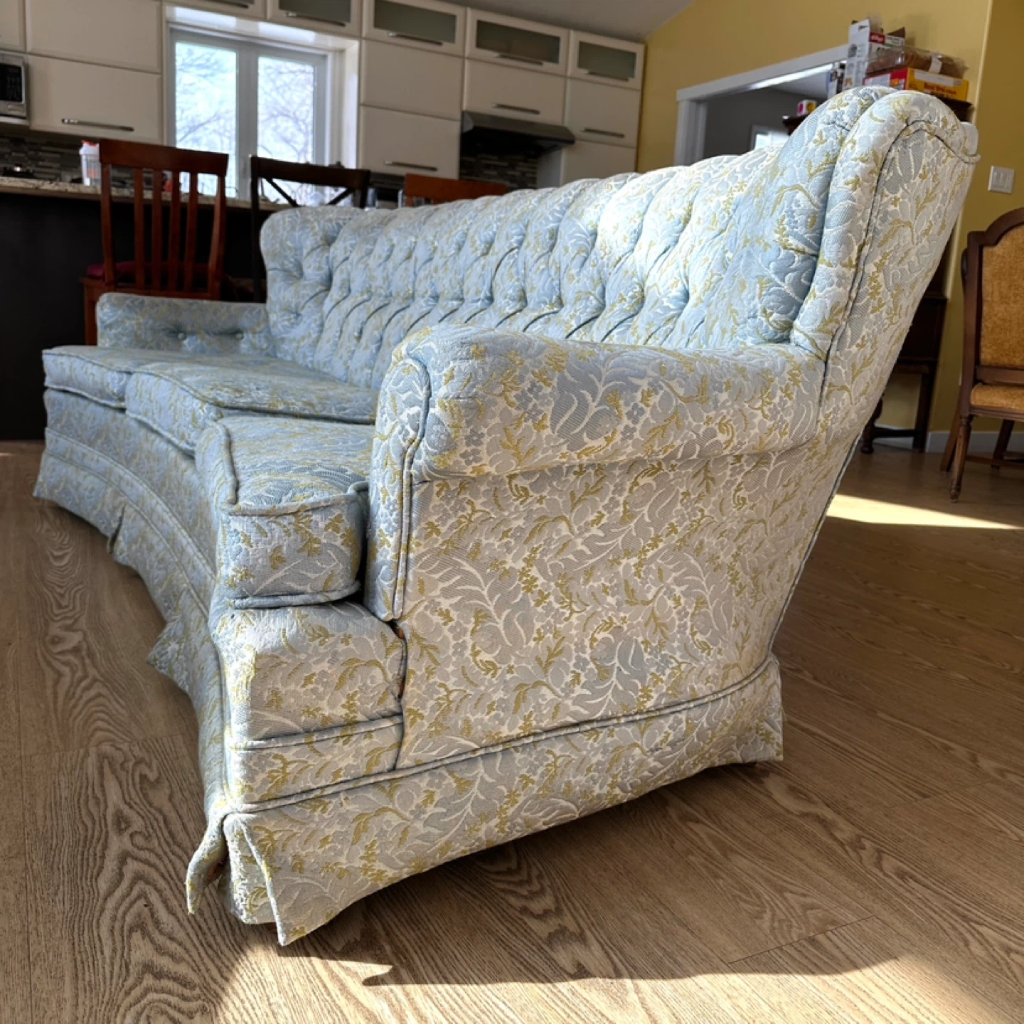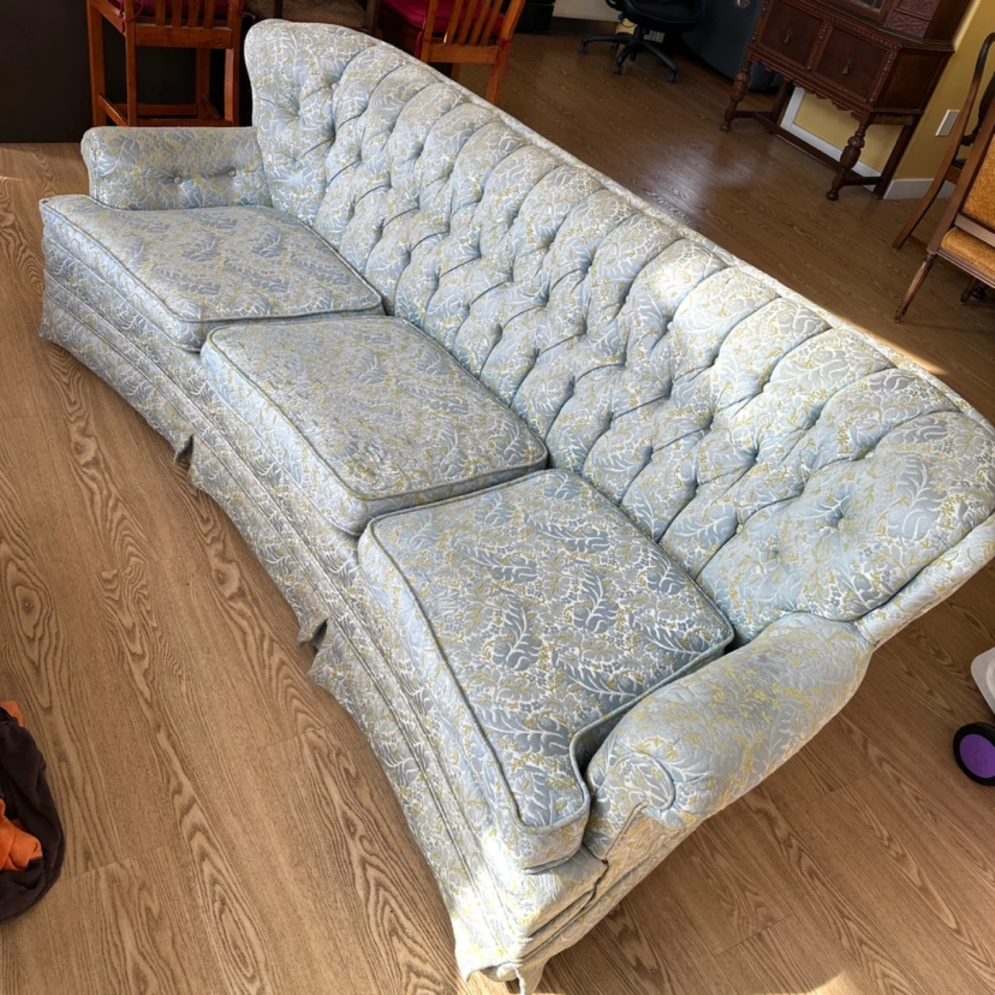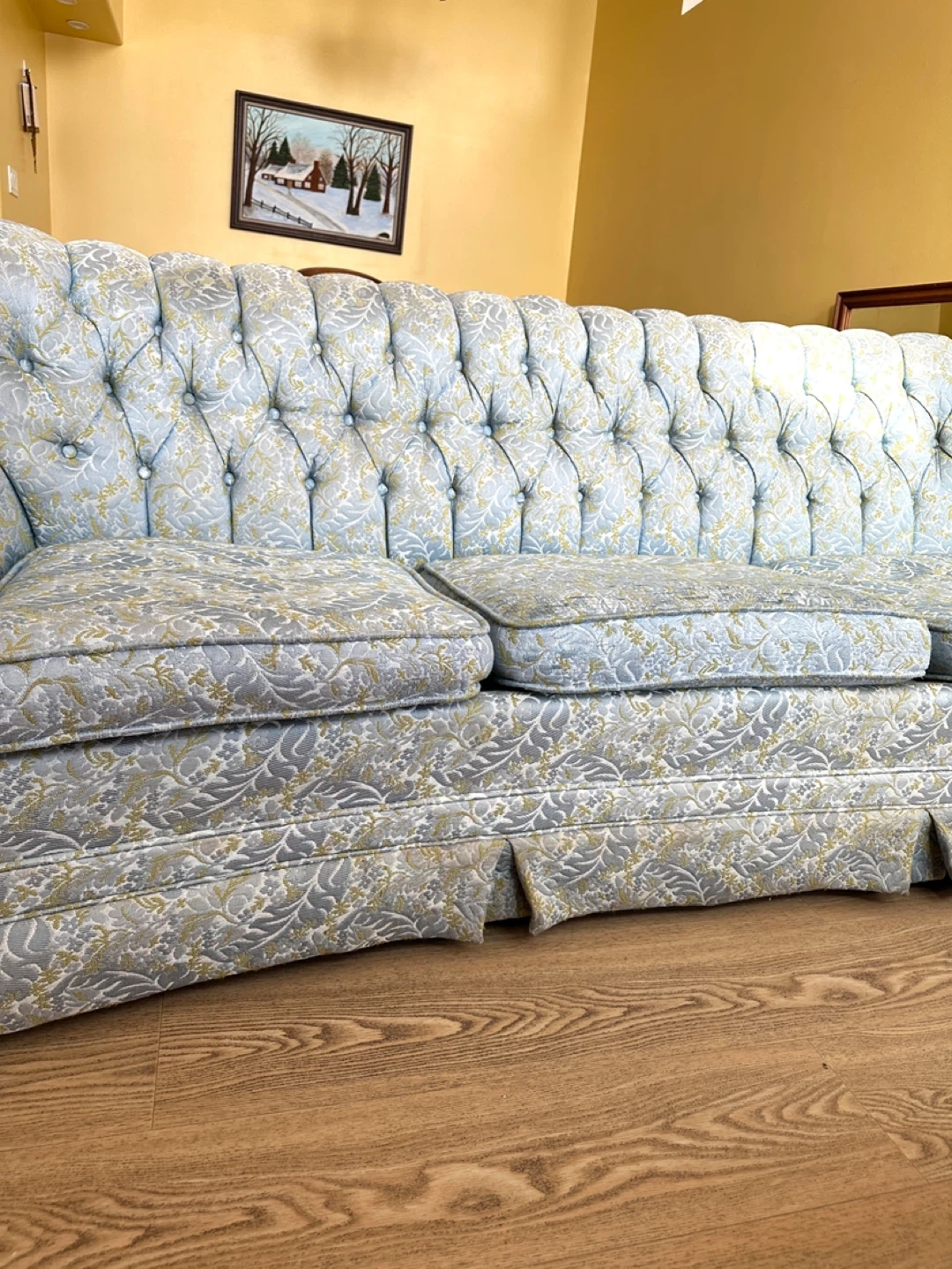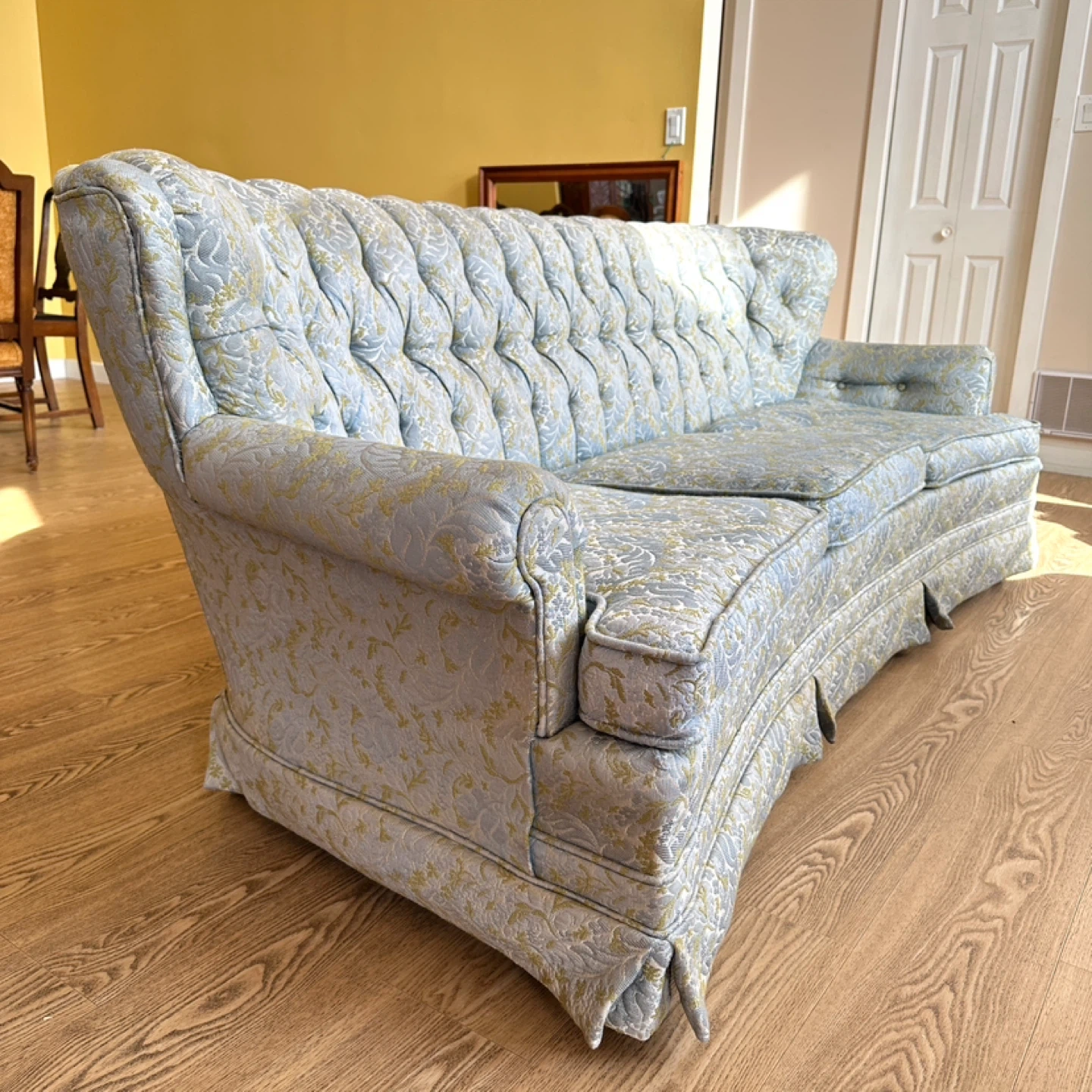 Beautiful vintage traditional sofa featuring a deep button-tufted back, rolled arms, and classic skirted base. Well-made with a sturdy frame and plush seating—perfect for a formal living room, cottage, or traditional décor.