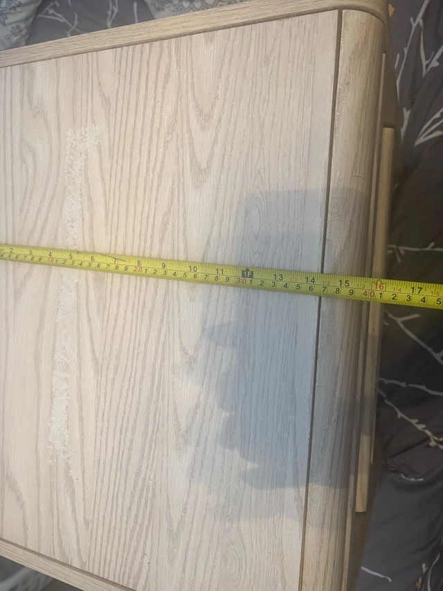 Sturdy, great bedside table with drawers. Small warp in wood shown on last photo, easy to fix. 21 1/2 inches tall, 16 inches wide, 20 3/4 inches long. Pick up in Kernohan.