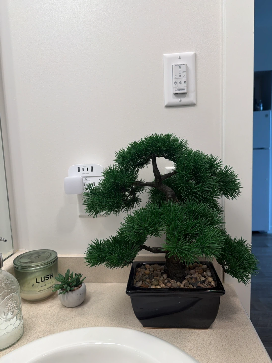 A lovely artificial bonsai tree sits in a shiny black pot. It's adorned with small stones around the base of the trunk. This little tree adds a touch of green without any upkeep!