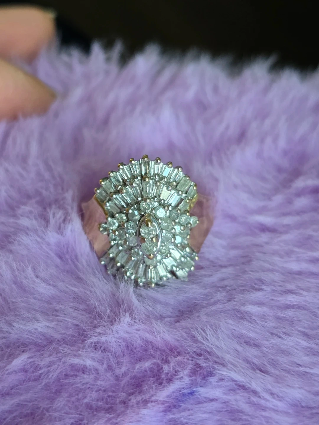 Sparkling diamond cluster ring with a unique design. Features a mix of baguette and round-cut diamonds set in gold-tone metal. It's a statement piece!