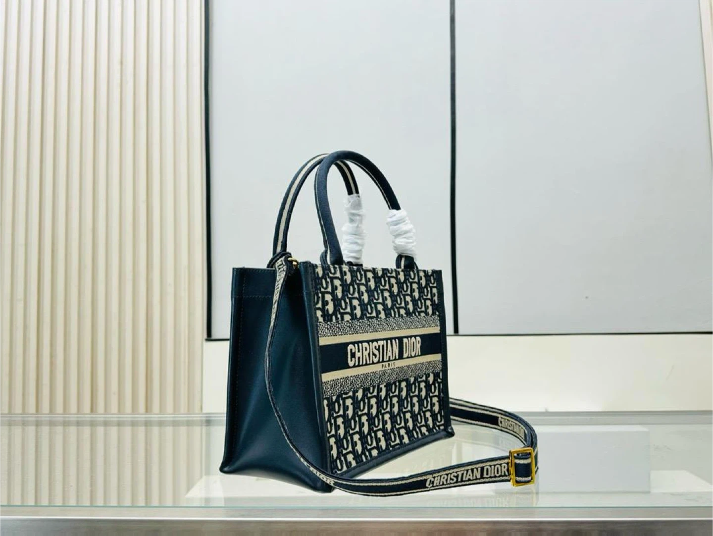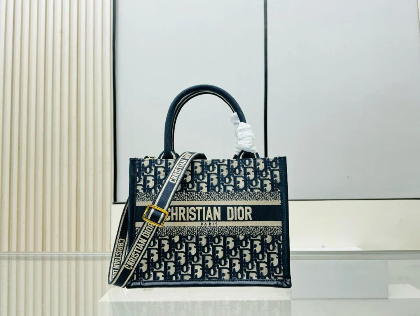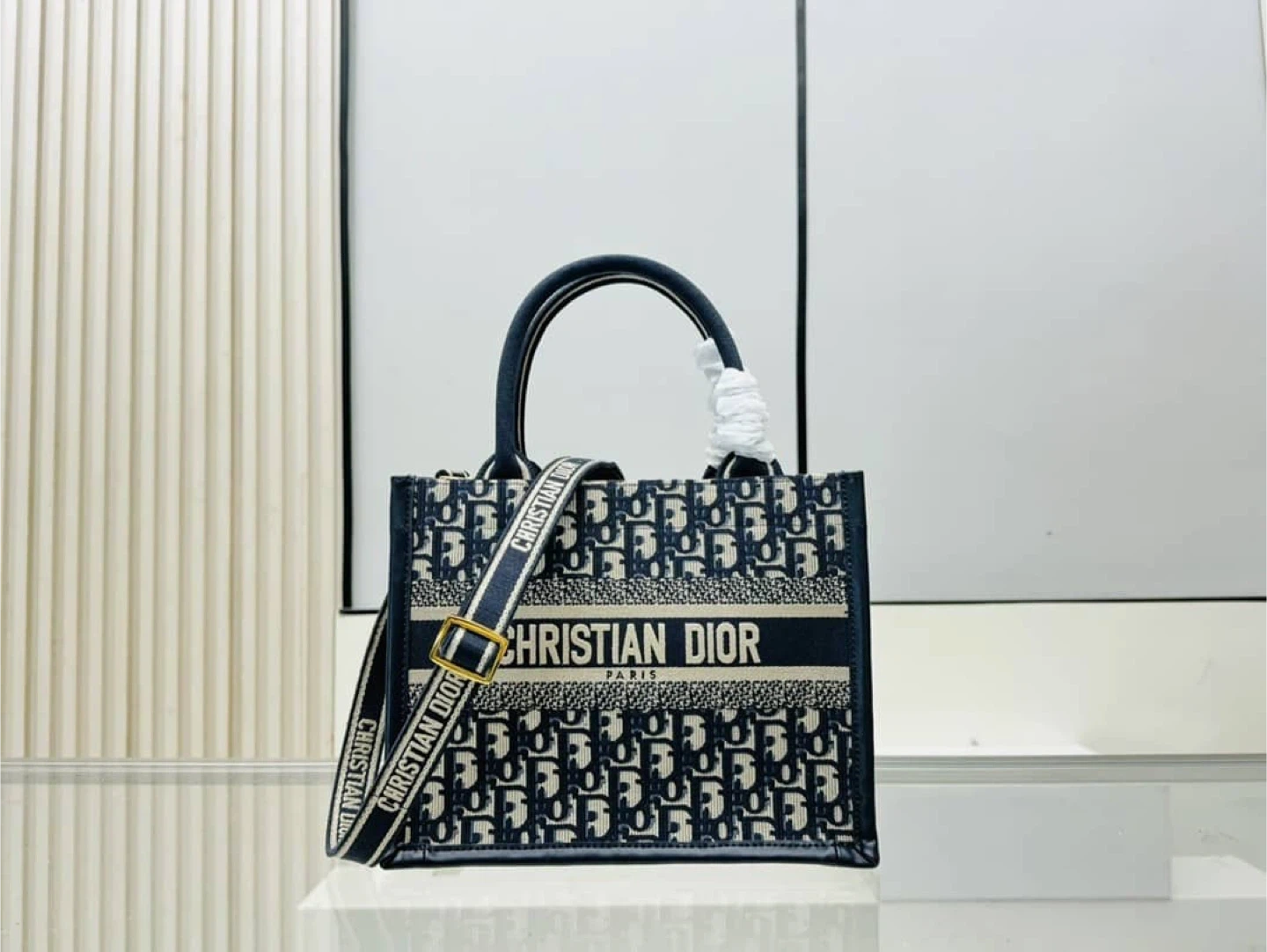 Christian Dior book tote bag in navy blue with signature Dior Oblique canvas. Features top handles and a removable shoulder strap. This stylish bag is great for everyday use!