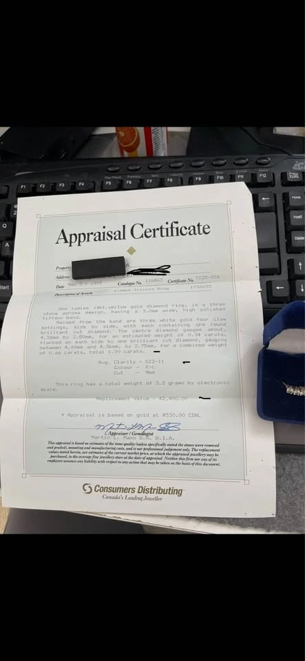 Ladies Trinity ring, 1k total diamond weight. Diamond is a natural stone, see appraisal for details. Selling because it no longer fits, I believe it's a size 8-9.