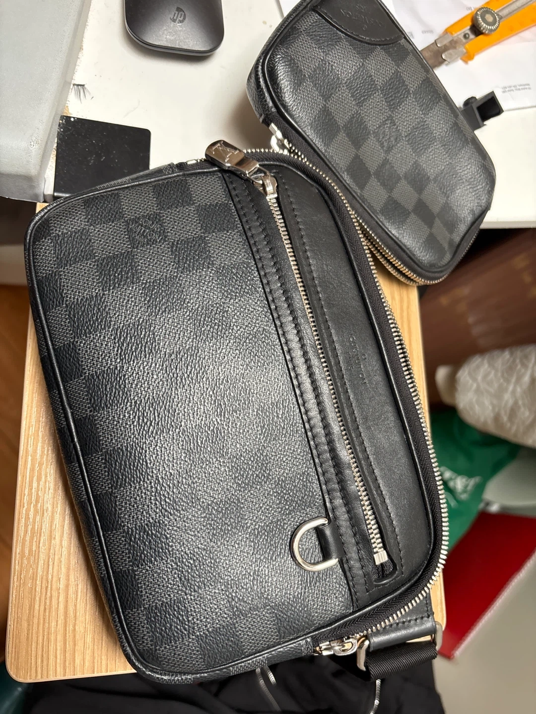 This Louis Vuitton Scott Messenger bag comes in the Damier Graphite pattern. It features a zip-around closure and an adjustable strap. A smaller detachable pouch is included. Got it in 2022, used it time to time but not my full time bag. No box or receipt as this was a gift long ago.