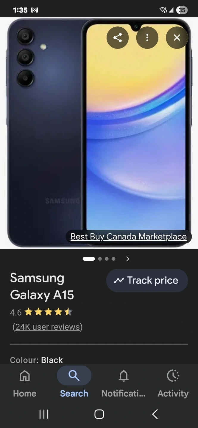 Samsung Galaxy A15 smartphone in black. It has 128 GB storage capacity. This phone is great for everyday use and capturing memories.