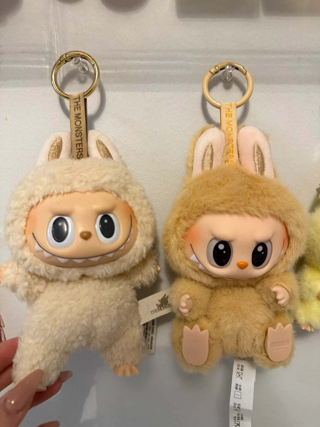 two plush keychains from The Monsters collection. One is a creamy white colour, and the other is a light brown. Both feature a fuzzy texture and attachable keyring. From popmart