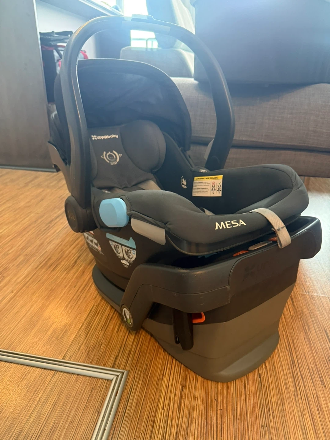 UPPAbaby MESA infant car seat and base. This car seat is black and features a 5-point harness system. It's designed for easy installation and provides a secure ride for your little one.