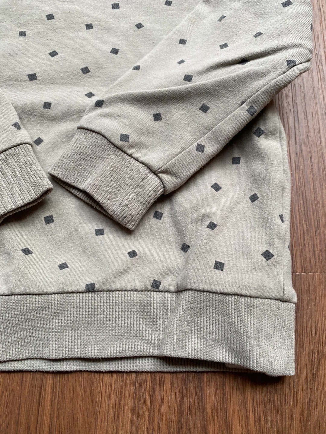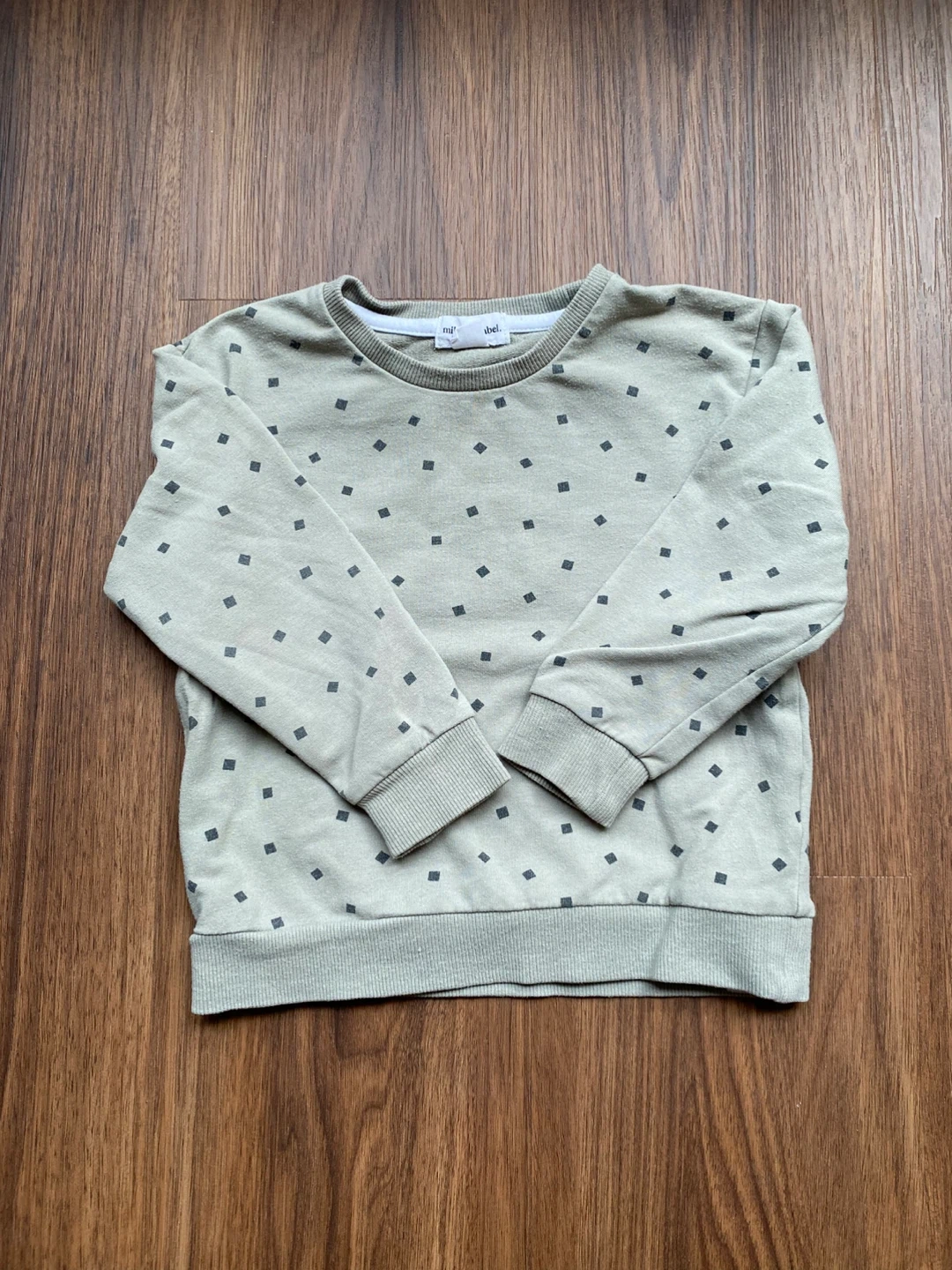 A cute Miles the Label crewneck sweatshirt for toddlers. It's a sage green colour with allover diamond pattern. Ribbed cuffs, collar, and hem. Organic cotton. Matching joggers available