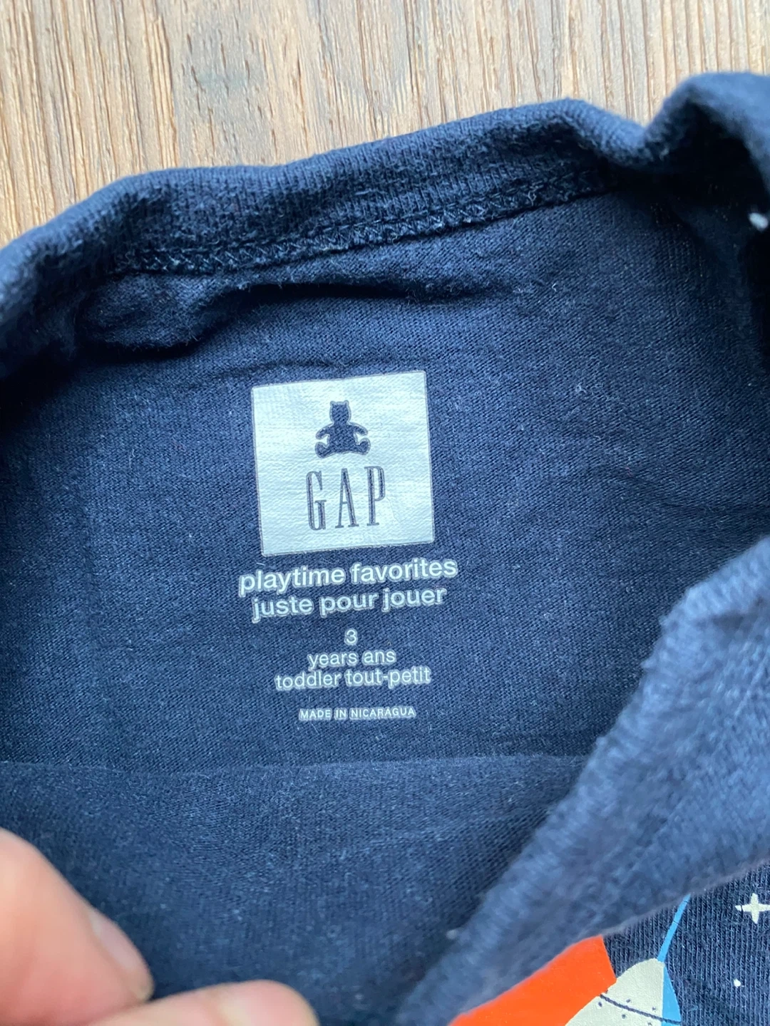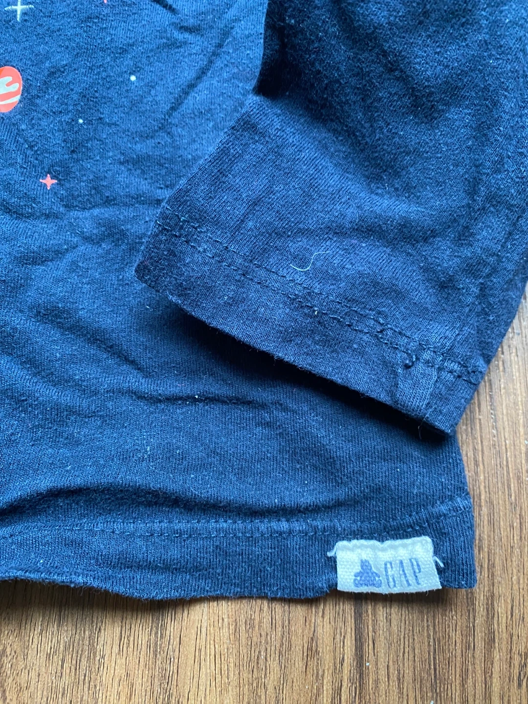 Navy blue long sleeve t-shirt from GAP featuring a fun rocket ship and space graphic. It's made of soft cotton and designed for toddlers. Perfect for little astronauts who love adventures in space!