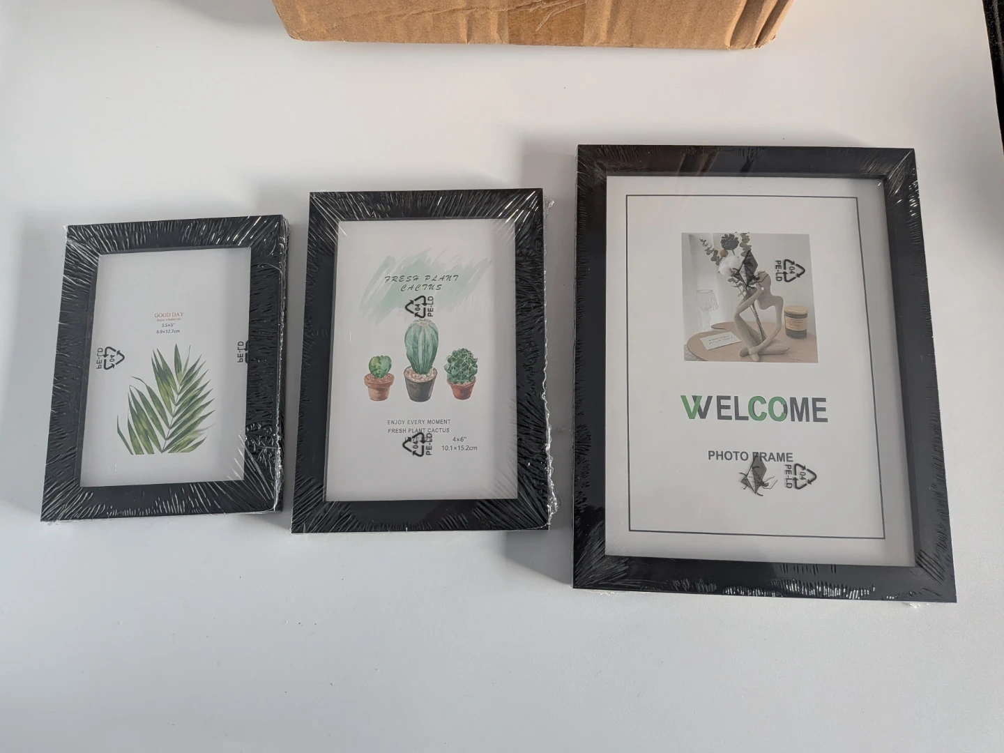 Set of 15 black photo frames. Includes 3 frames measuring 15x20cm (6x8 inches), 8 frames measuring 10x15cm (4x6 inches), and 4 frames measuring 9x13cm (3.5x5 inches). They're great for displaying your favourite memories!