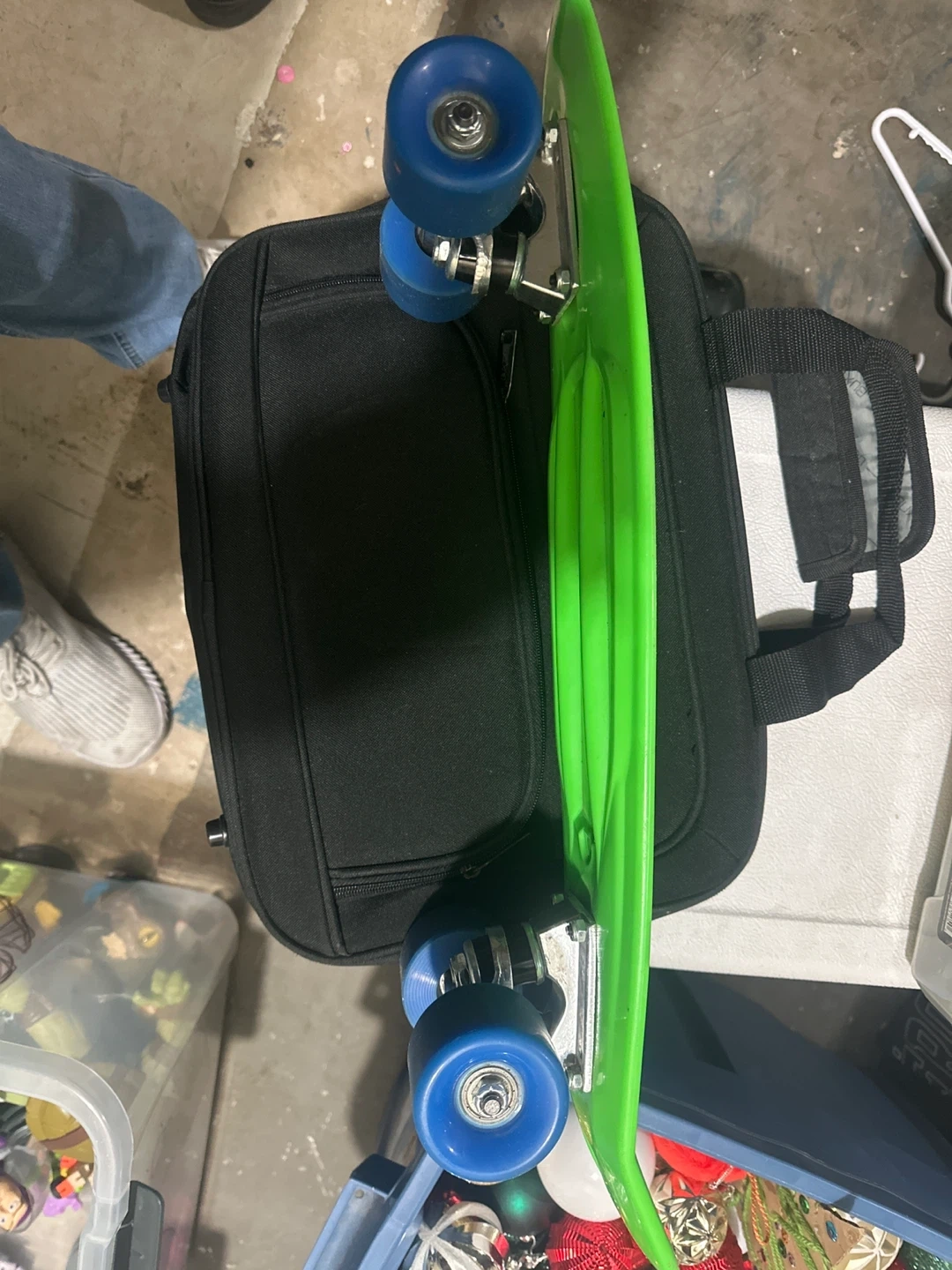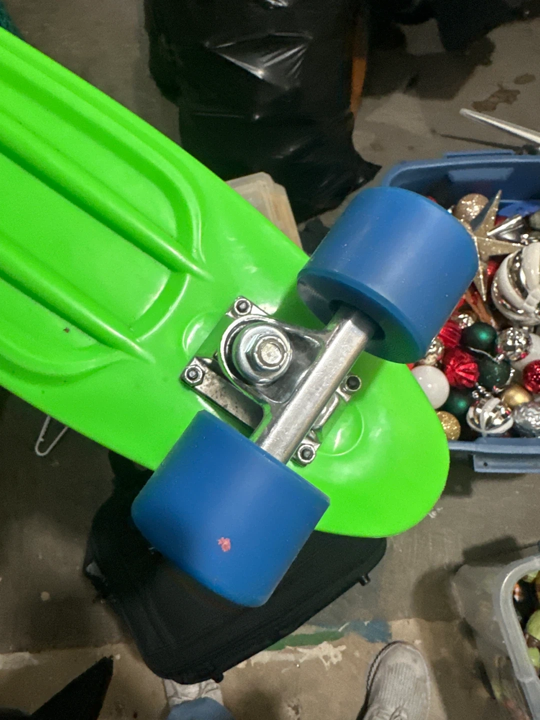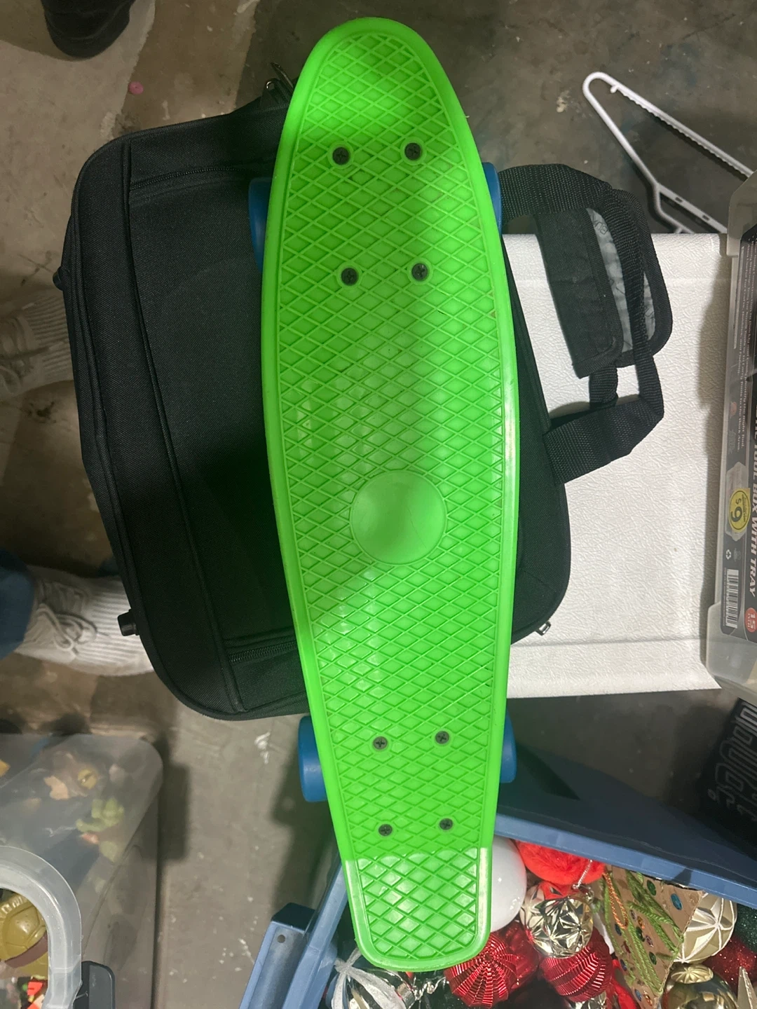 Bright green plastic deck skateboard with blue wheels. It's a fun size for cruising around. Perfect for quick trips or just for fun! Length is about 55cm. Wanted my kid to learn but he is not motivated so I just want to sell it, plus I’m cleaning the basement so I need to get rid of a few things.