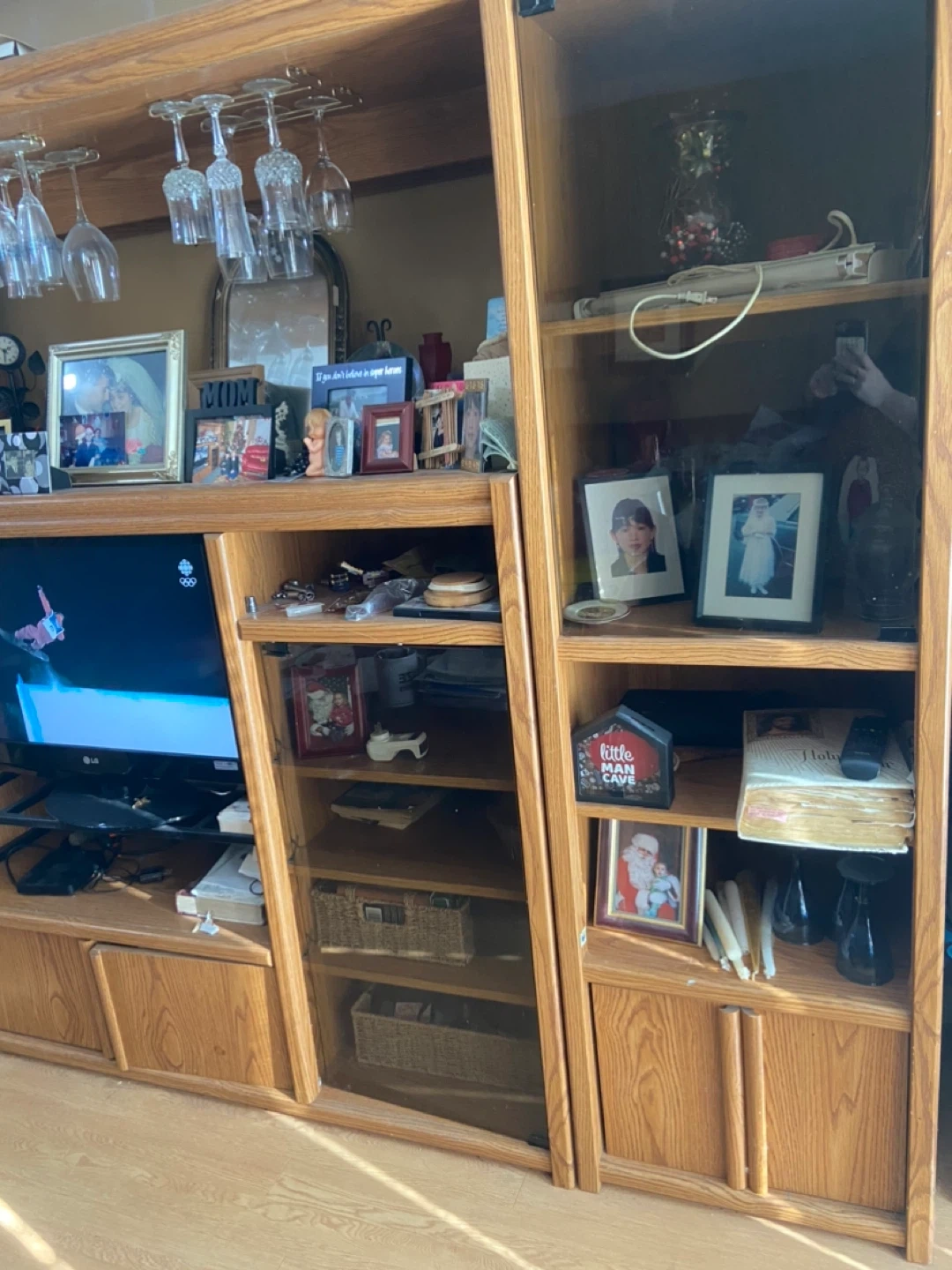 This is a large oak entertainment unit. It features multiple shelves, cabinet storage, and a built-in rack for hanging wine glasses. It's perfect for organizing your media and display items. The unit has a classic wood finish.