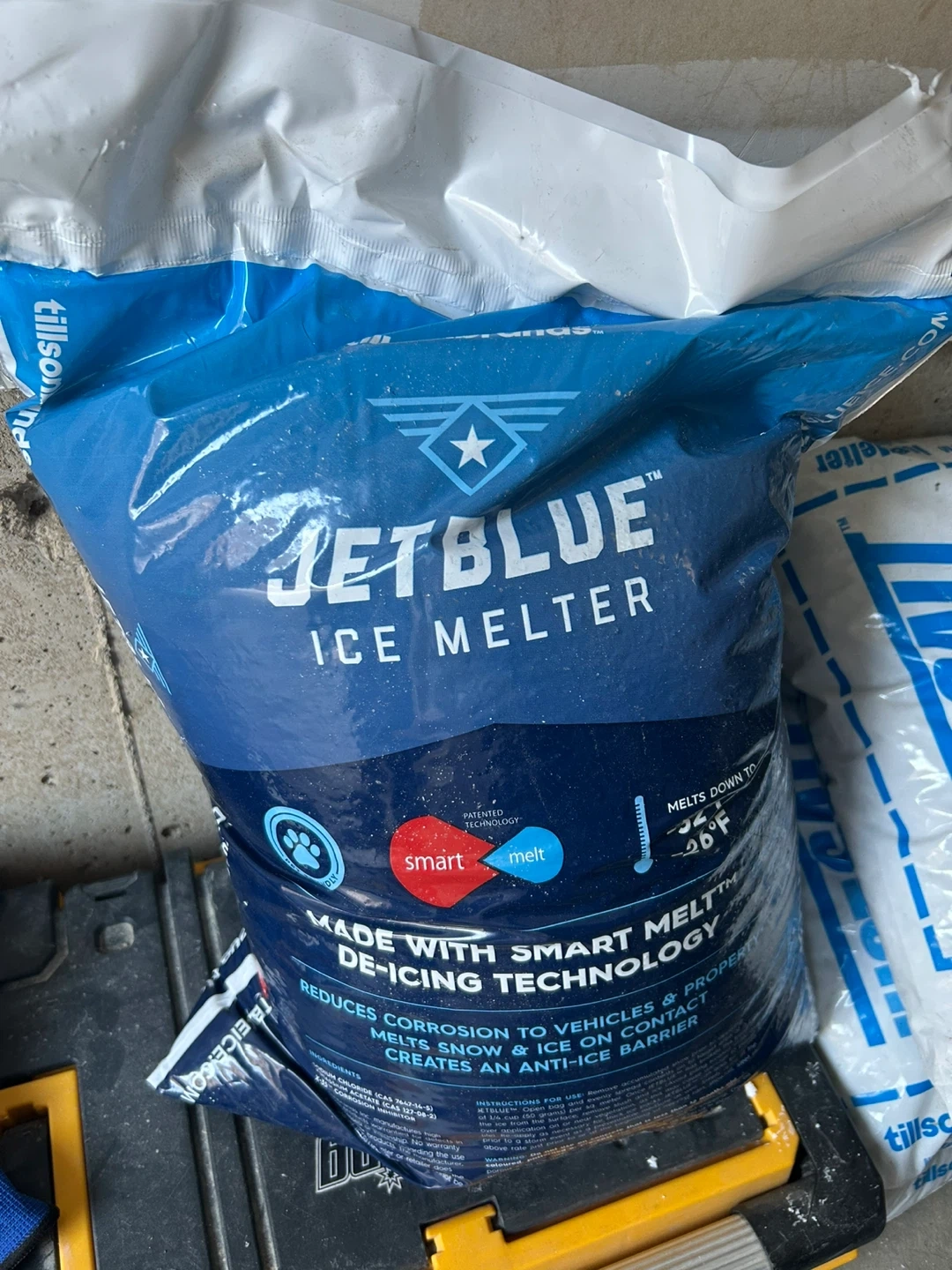This bag of Jetblue Ice Melter uses smart melt de-icing technology. It reduces corrosion to vehicles and property. It melts snow and ice on contact and creates an anti-ice barrier.