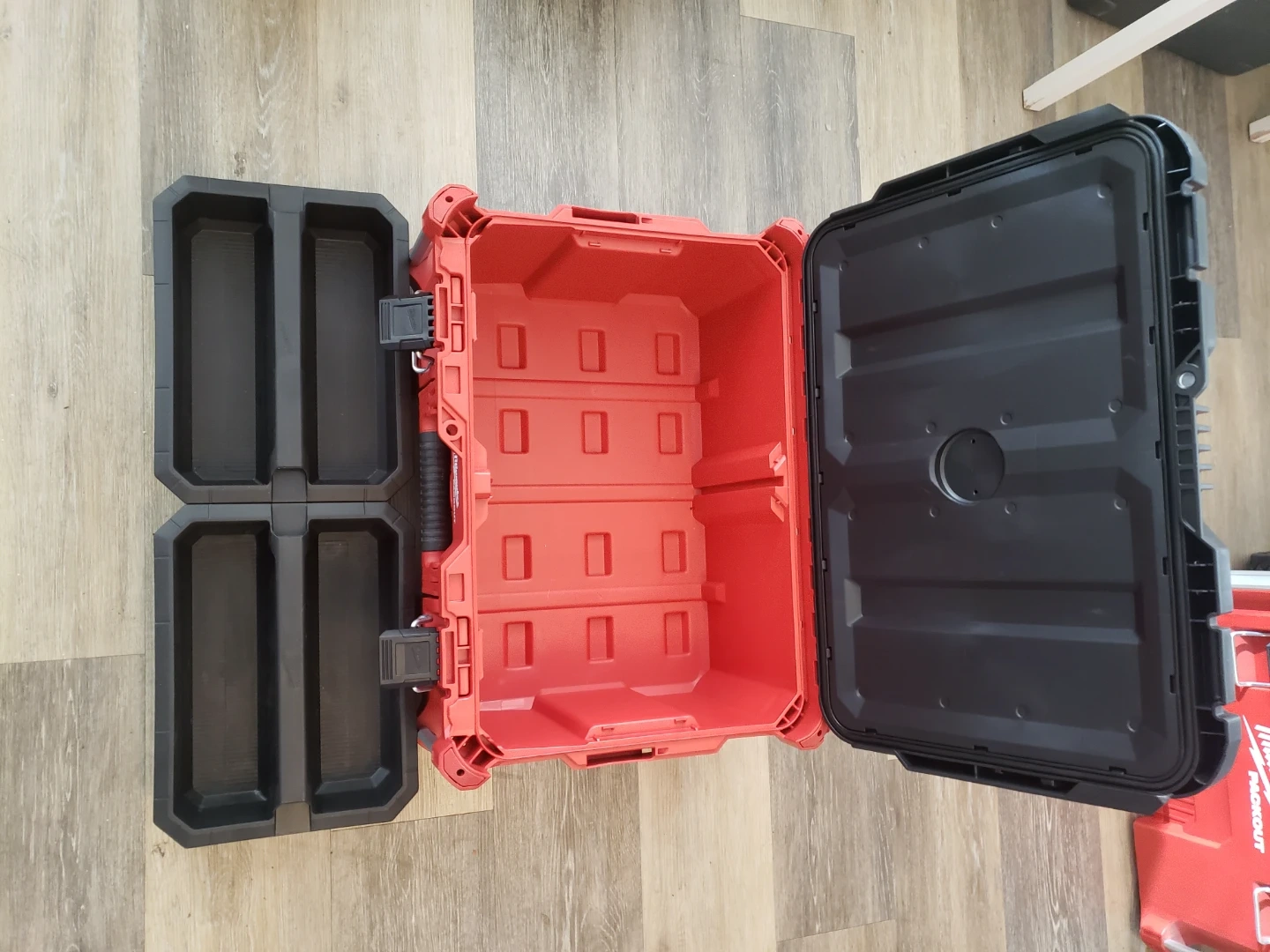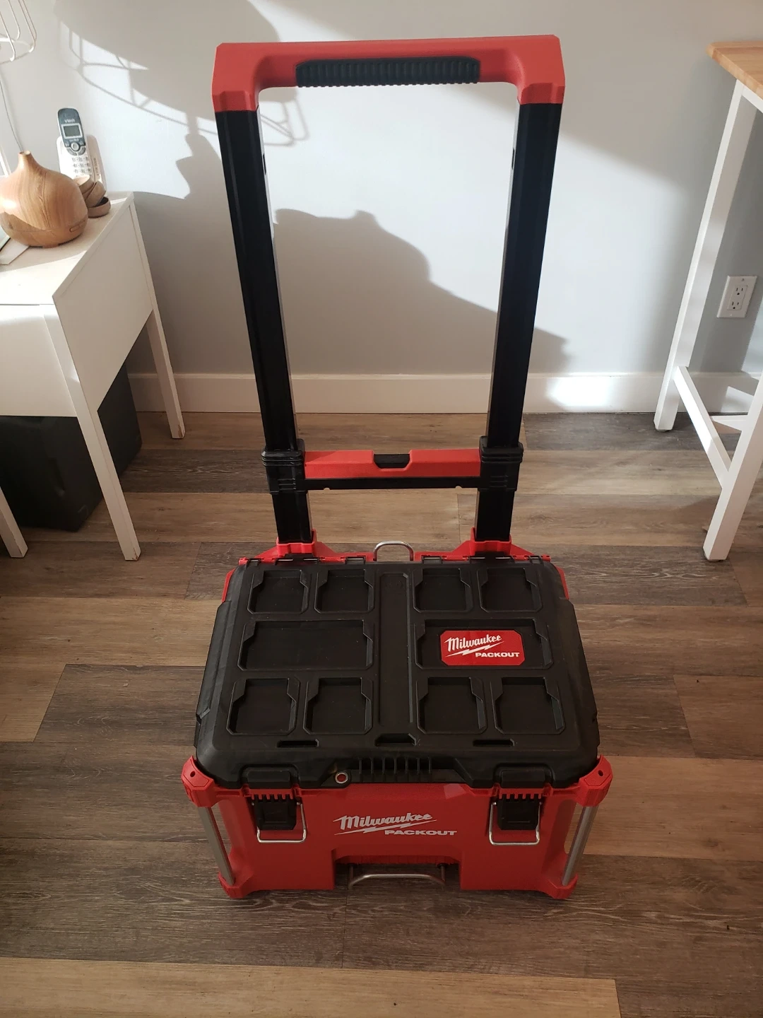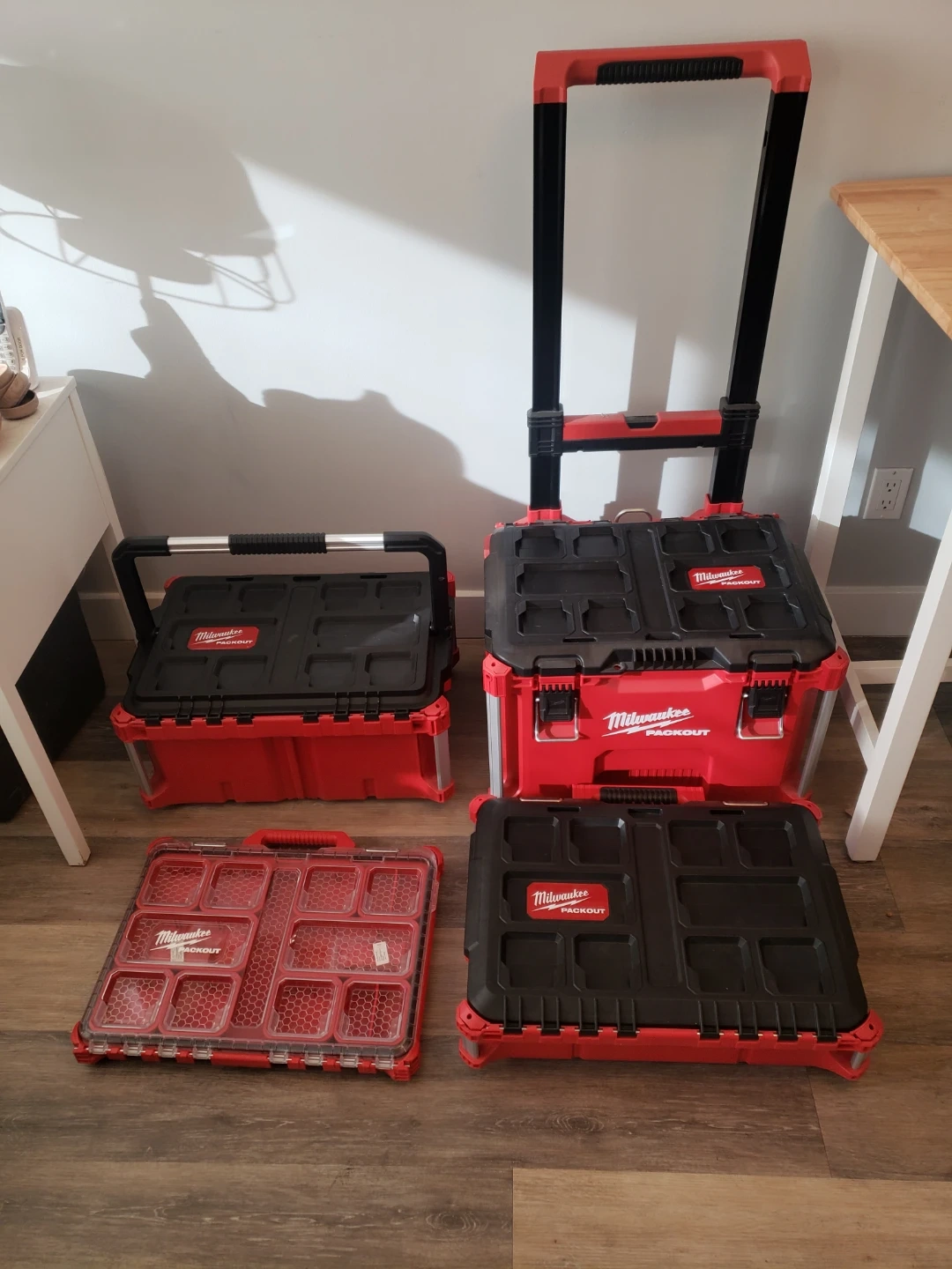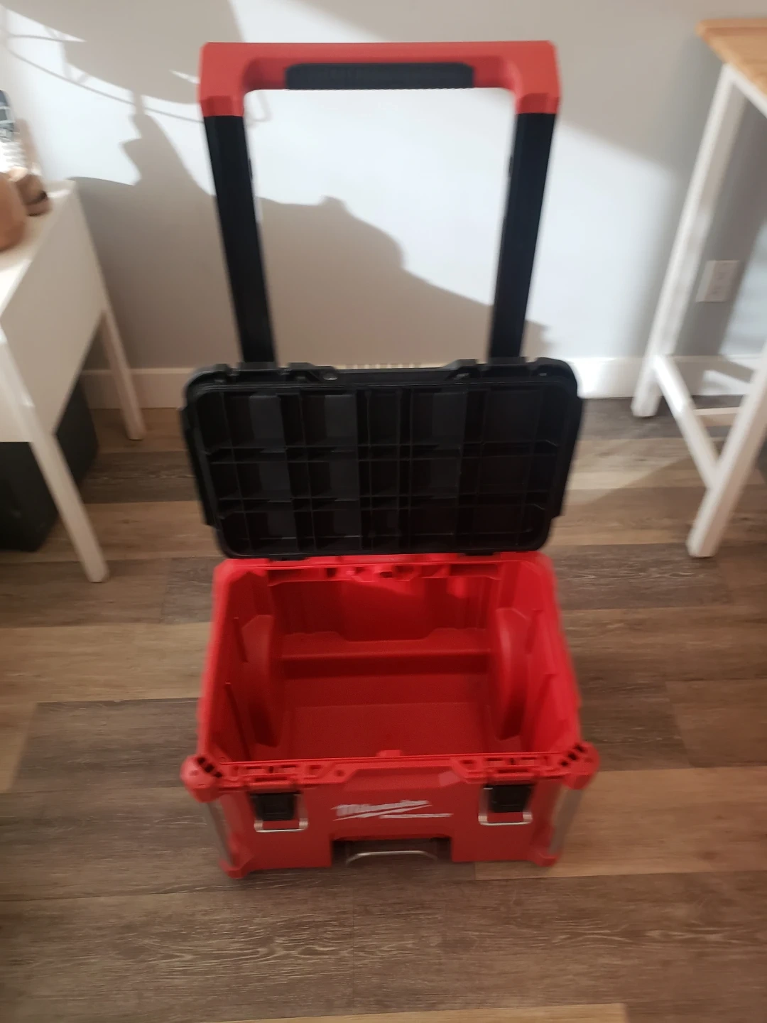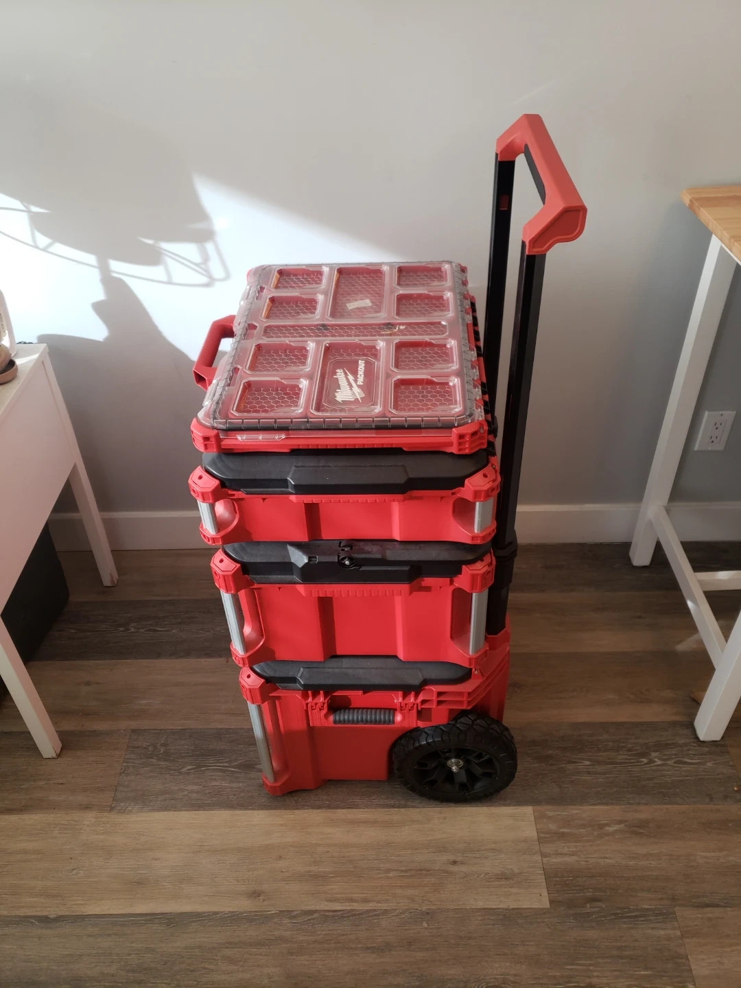 Selling a Milwaukee PACKOUT rolling tool box system. Includes a rolling cart, large tool box, and a small organizer. Sturdy construction for tradespeople. USED ONLY FOR TOOL STORAGE IN MY CONDO. NEVER USED ON A JOB SITE.