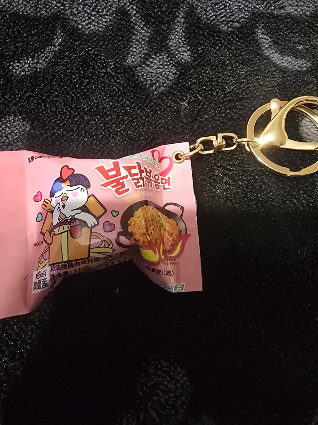 This is a cute keychain featuring a miniature package of Samyang Buldak noodles. It's got a playful cartoon design and a gold-toned clasp. A fun accessory for any fan of spicy ramen!