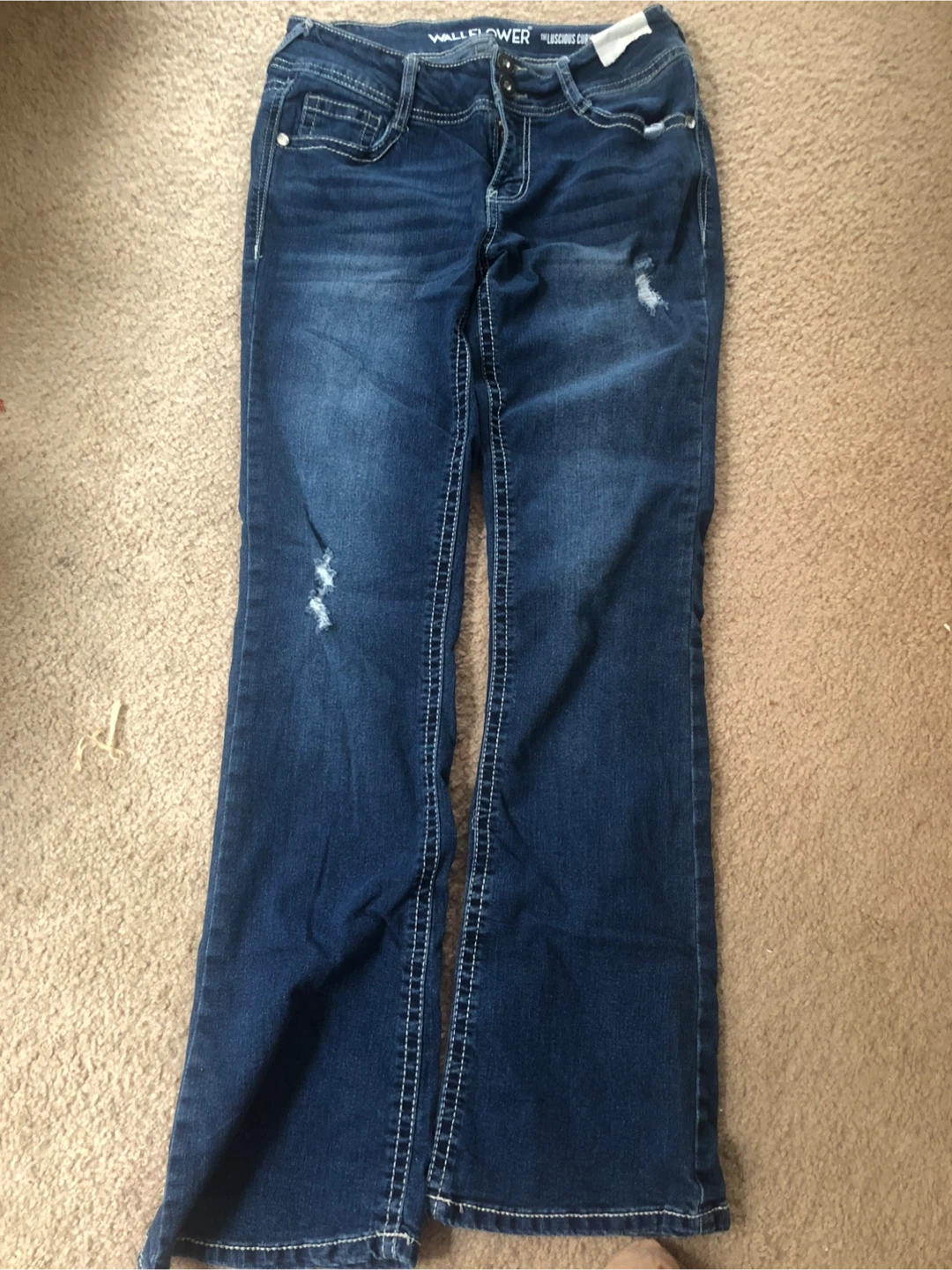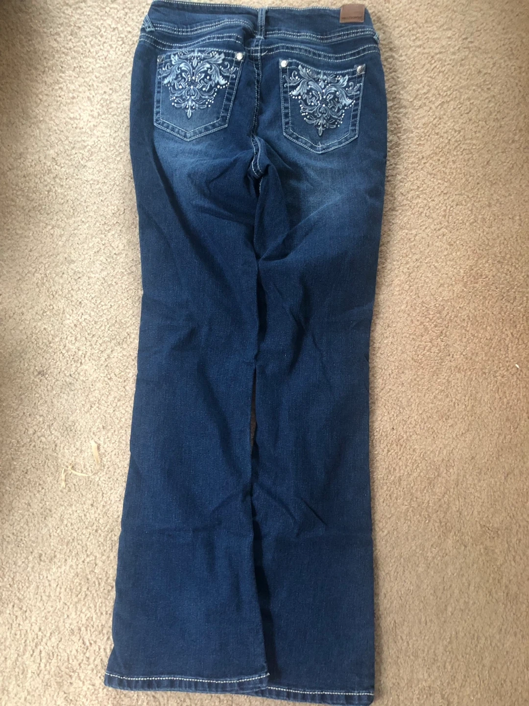 These Wallflower women's bootcut jeans are a size 7. They feature decorative embellishments on the back pockets. Denim material.