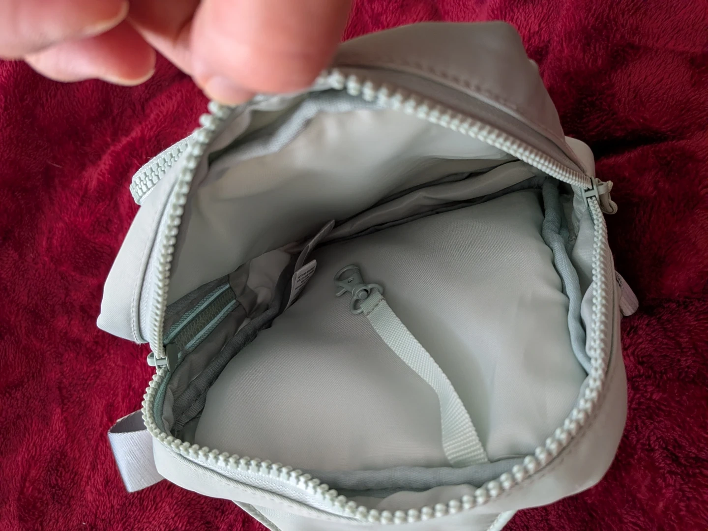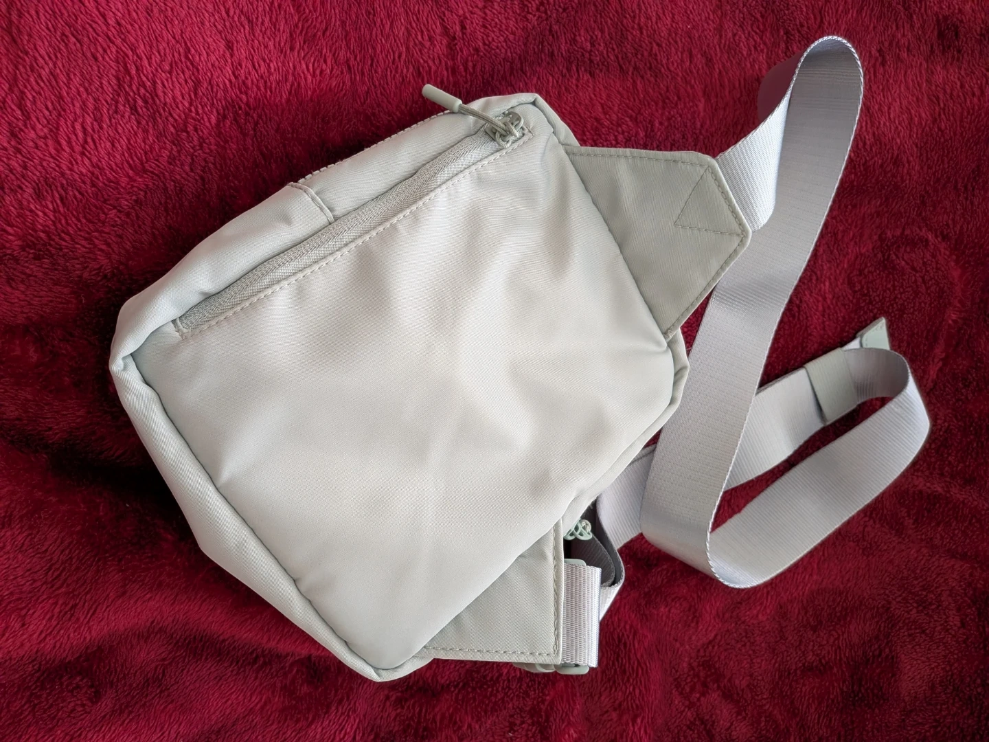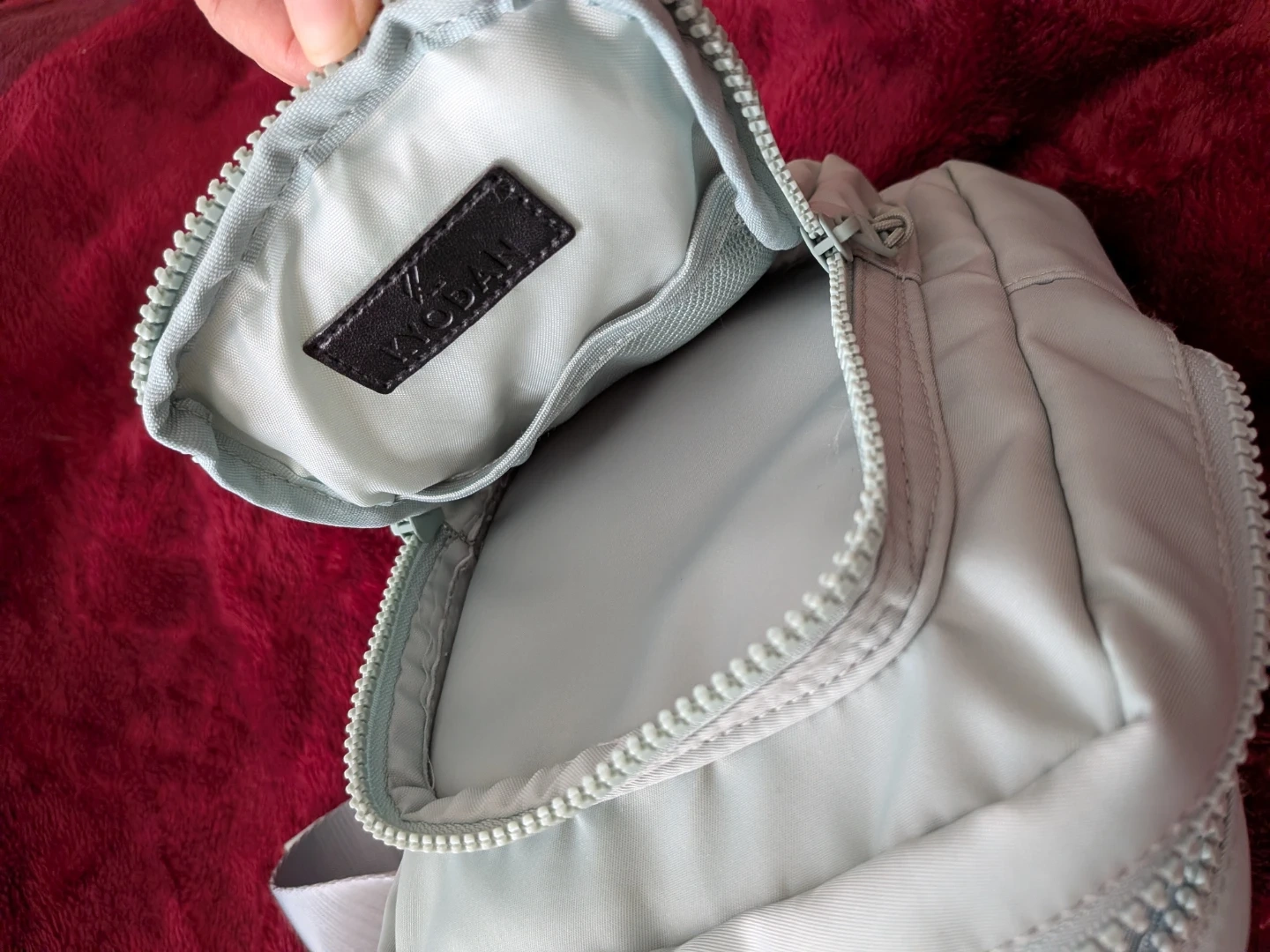 This Kyodan crossbody bag is a light mint green colour - tried taking photo in another light to show its adorable mint colour! Almost like new as I've only had it for less than a month and rarely used it - need something bigger to hold my planner. It's made of nylon and has a zippered main compartment with an interior pocket. All zippers work smoothly; no cosmetic flaws or structural damages. Also has a hidden bottle holder that is tucked into the back compartment (where you can also securely tuck away cash, keys, etc.). Make this your everyday bag!