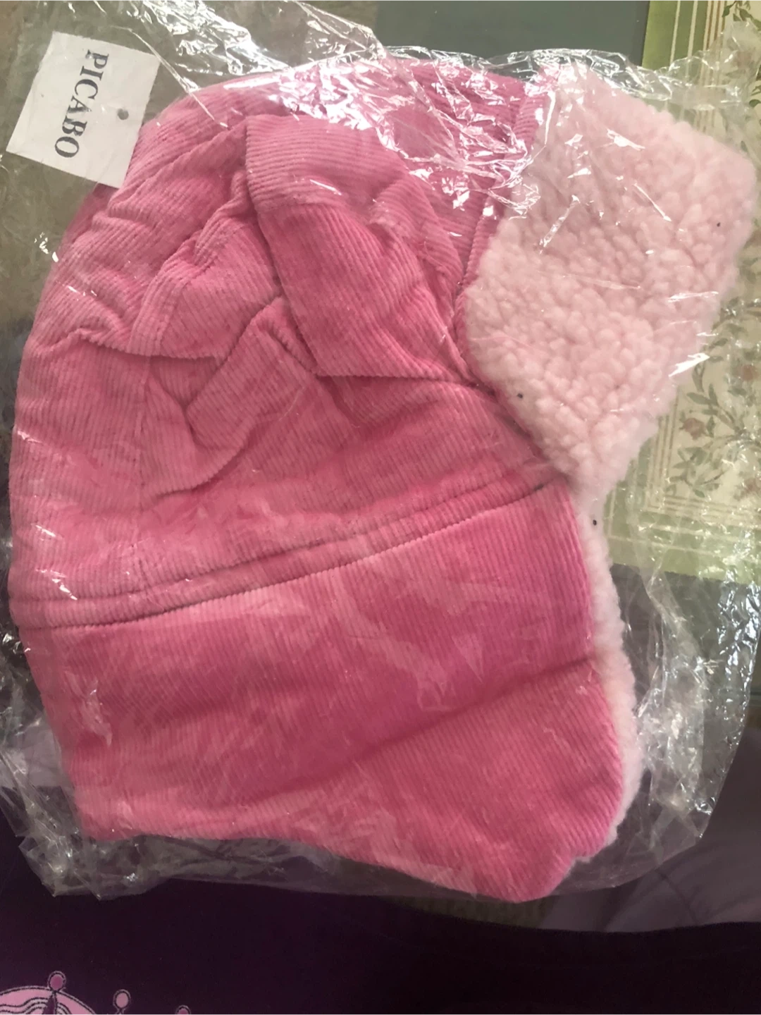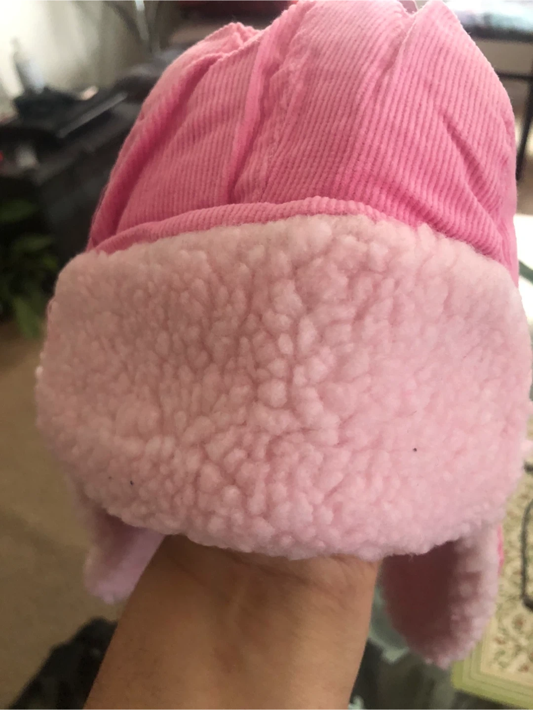 A warm pink corduroy trapper hat with a fluffy lining. It's perfect for keeping little ones cozy during colder weather.