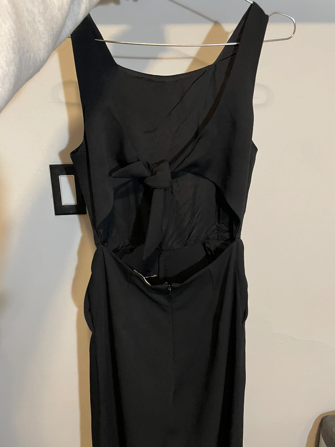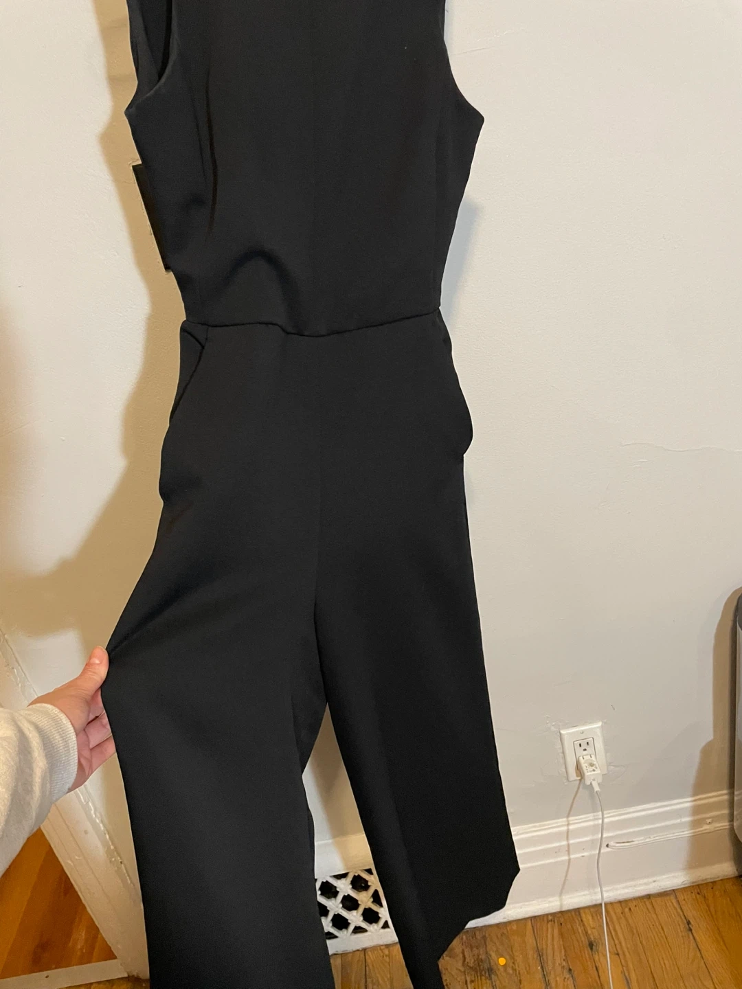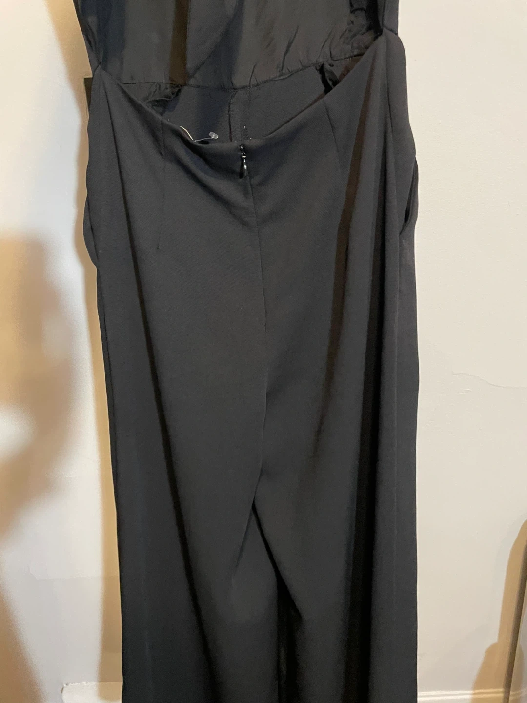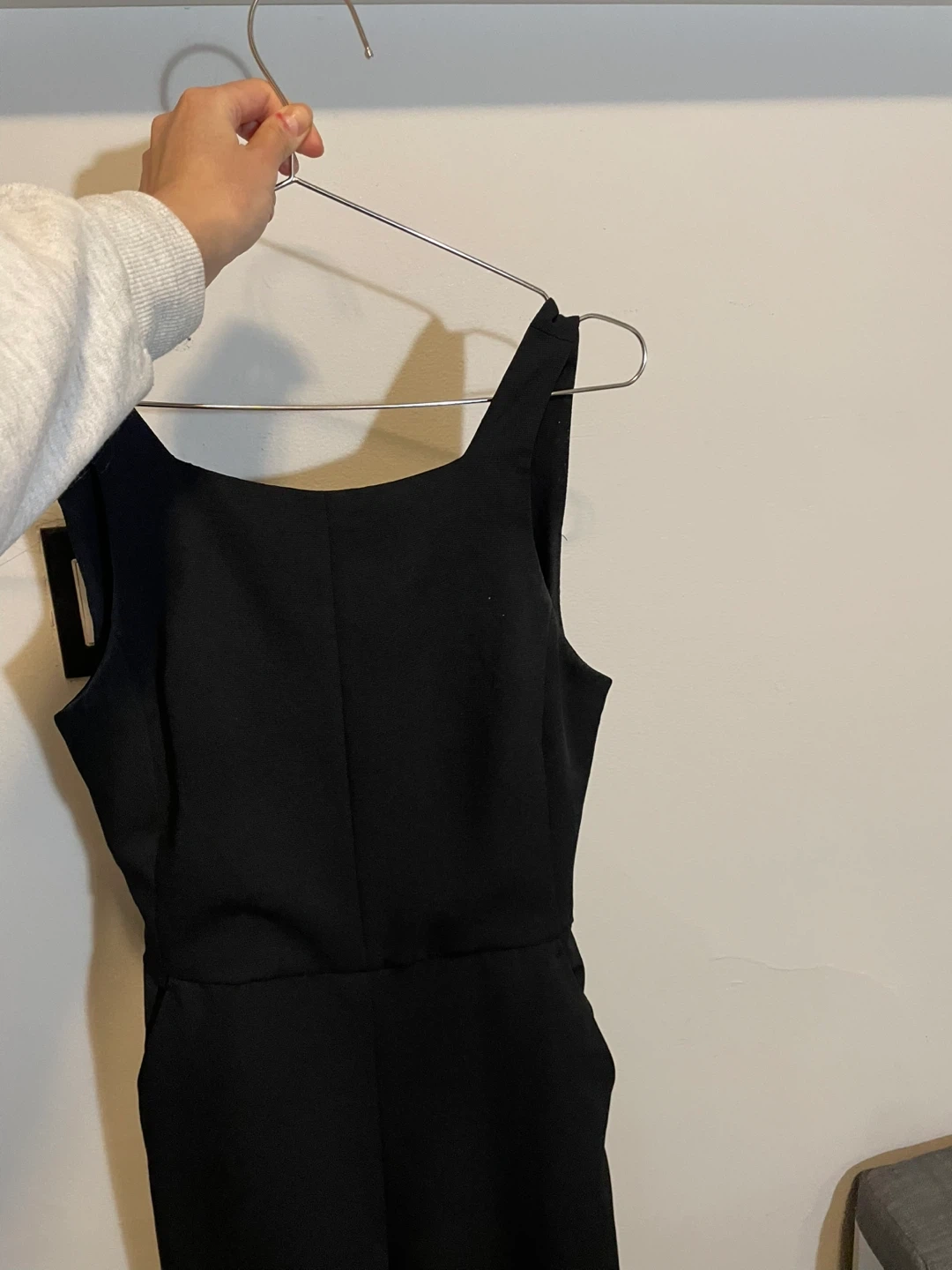 This stylish black jumpsuit features a square neckline and a flattering wide-leg silhouette. It ties at the back for a chic.