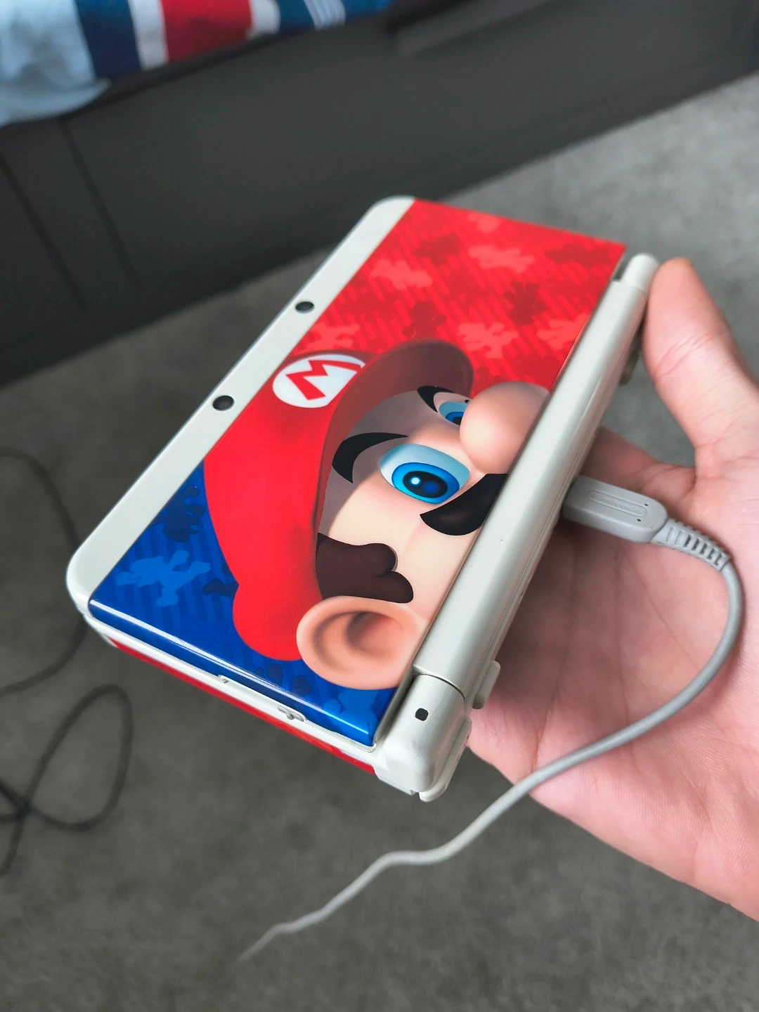 White Nintendo 3DS with Mario edition. It's a great handheld console for gaming on the go. Includes Minecraft game cartridge and charger.