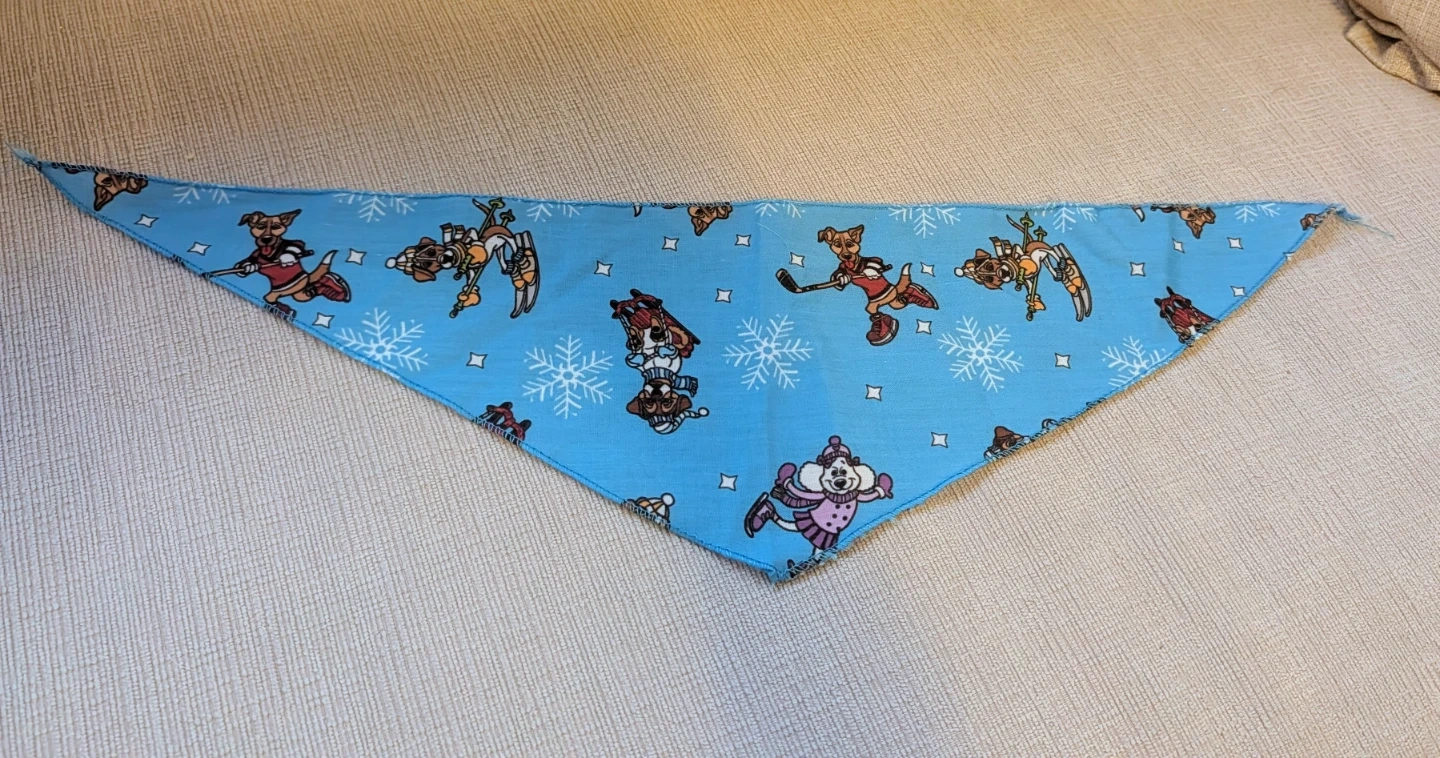 A cute blue bandana for your furry friend, featuring a fun pattern of dogs playing in the snow. It's made of fabric and perfect for the winter season. This bandana would be great for dressing up your pup for holiday photos or just for fun!