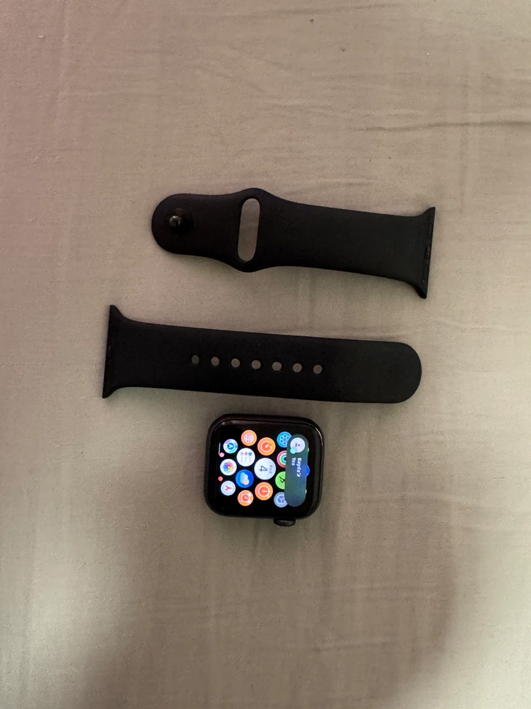 This is an Apple Watch SE (GPS) in space grey. It comes with two black sport bands. It's a great smartwatch for tracking your fitness and staying connected.