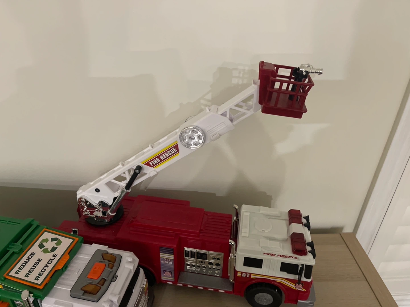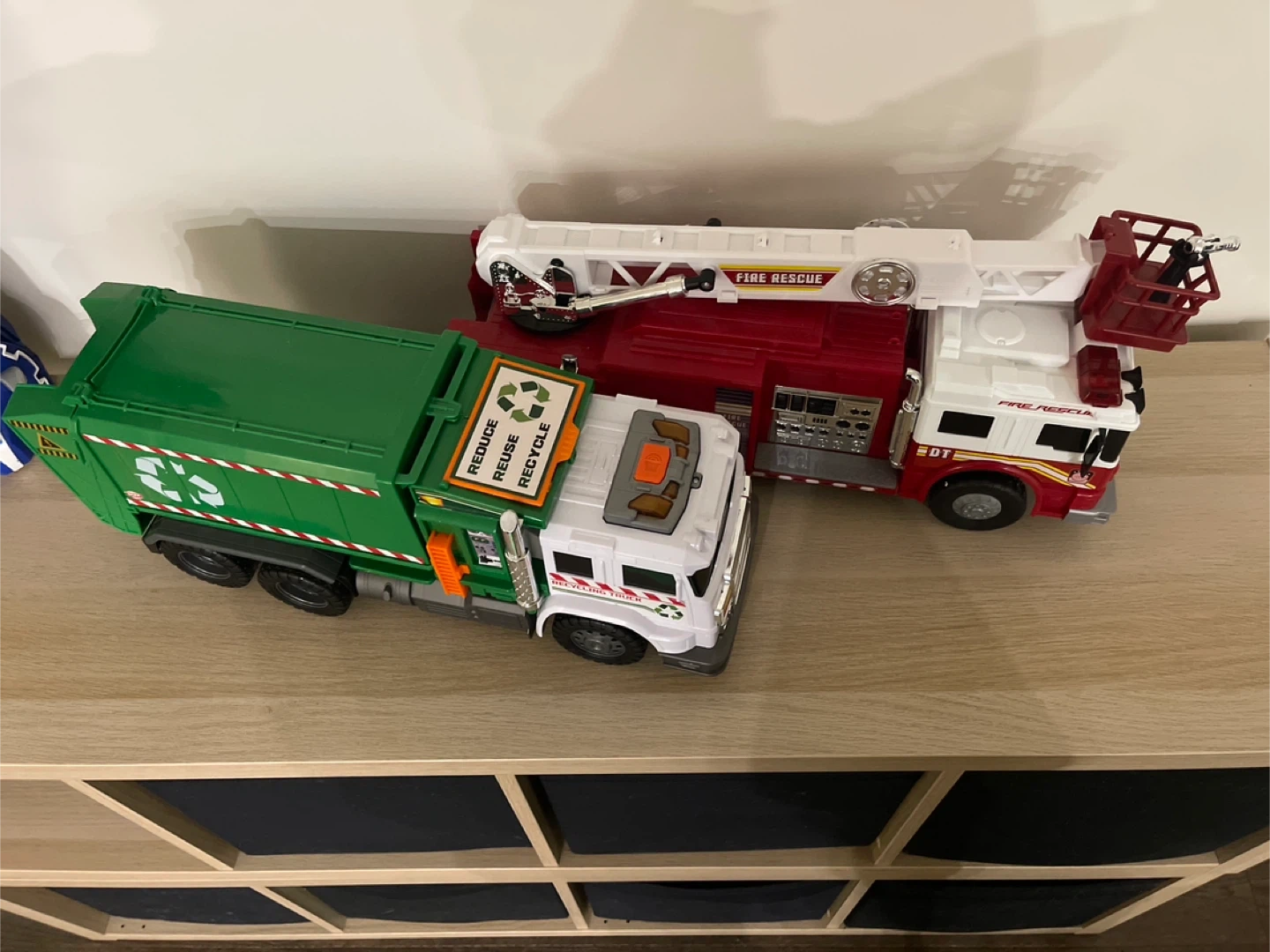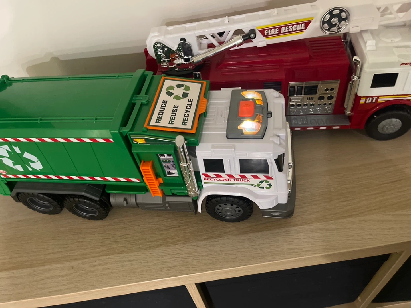 A green recycling truck with "REDUCE REUSE RECYCLE" signage. It's accompanied by a red and white "FIRE RESCUE" truck with a ladder.