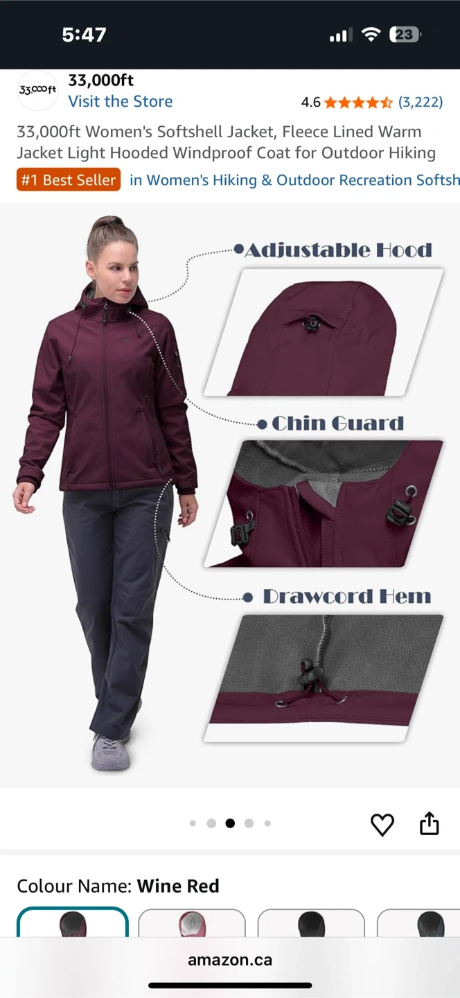 This women's softshell jacket is fleece-lined and windproof. It features an adjustable hood and a drawcord hem. Made for outdoor activities like hiking. Available in Wine Red.