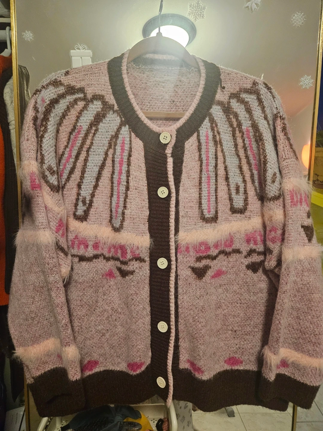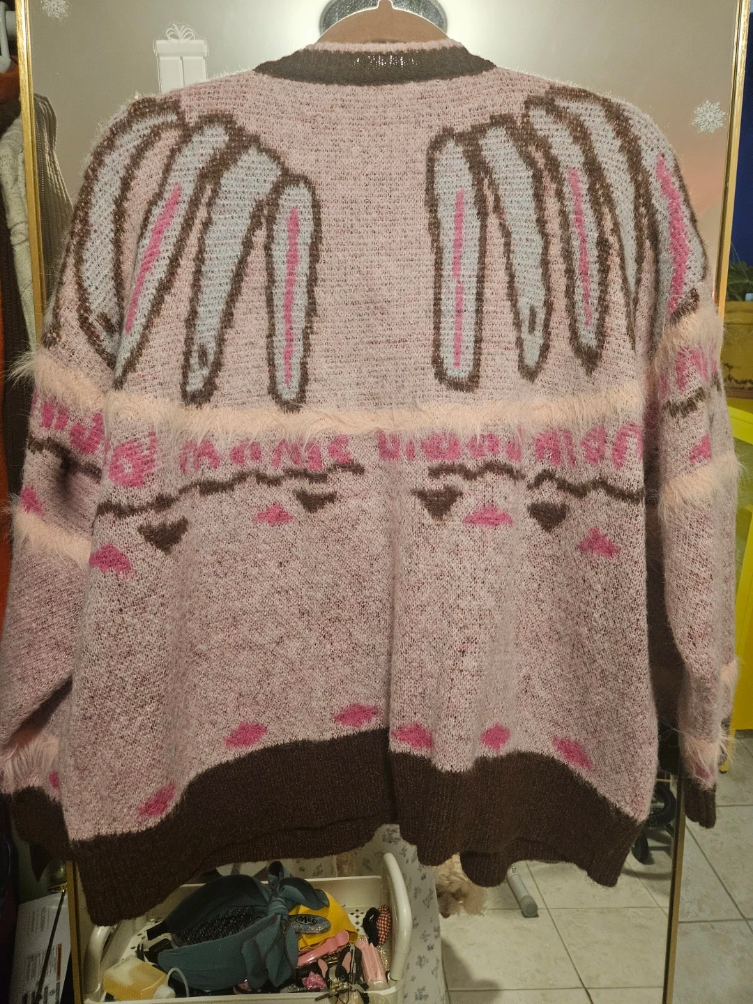 Cozy pink knit cardigan featuring a cute bunny graphic on the front and back. It has a dark brown collar and hem. Buttons up the front.