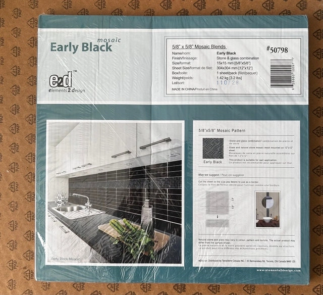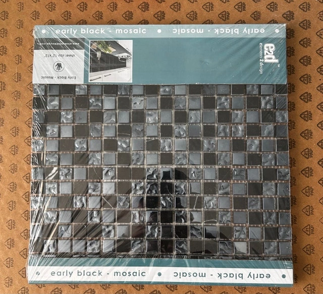 Refresh your space with this new Elements 2 Design Early Black Mosaic tile, perfect for adding a touch of modern elegance to any room. Each sheet measures 12x12 inches, featuring 5/8" x 5/8" stone and glass combination, ready to install and transform your kitchen or bathroom! Specifications: Brand: Elements 2 Design Colour: Early Black Size: 12" x 12" sheet size Material: Stone & Glass Style: Mosaic Pattern: 5/8" x 5/8”. I have 48 sq ft available for $5 per square foot. If the ad's up, it's still available! Cash only. Pickup in East York.