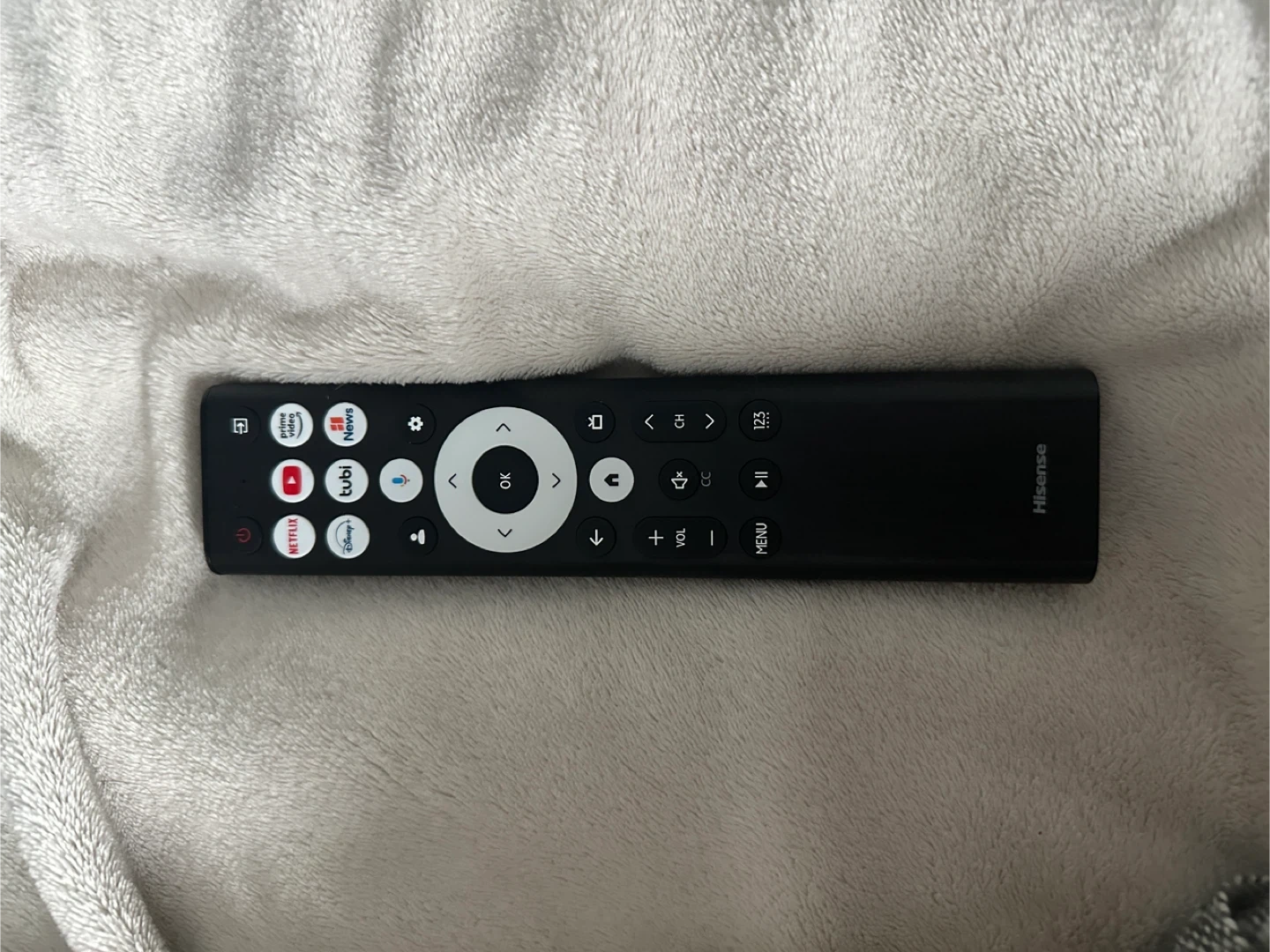 This is a Hisense smart TV. It comes with a remote control. Also includes two black stand pieces. The TV has Google TV and pre-loaded apps like Netflix, YouTube, and Disney+.