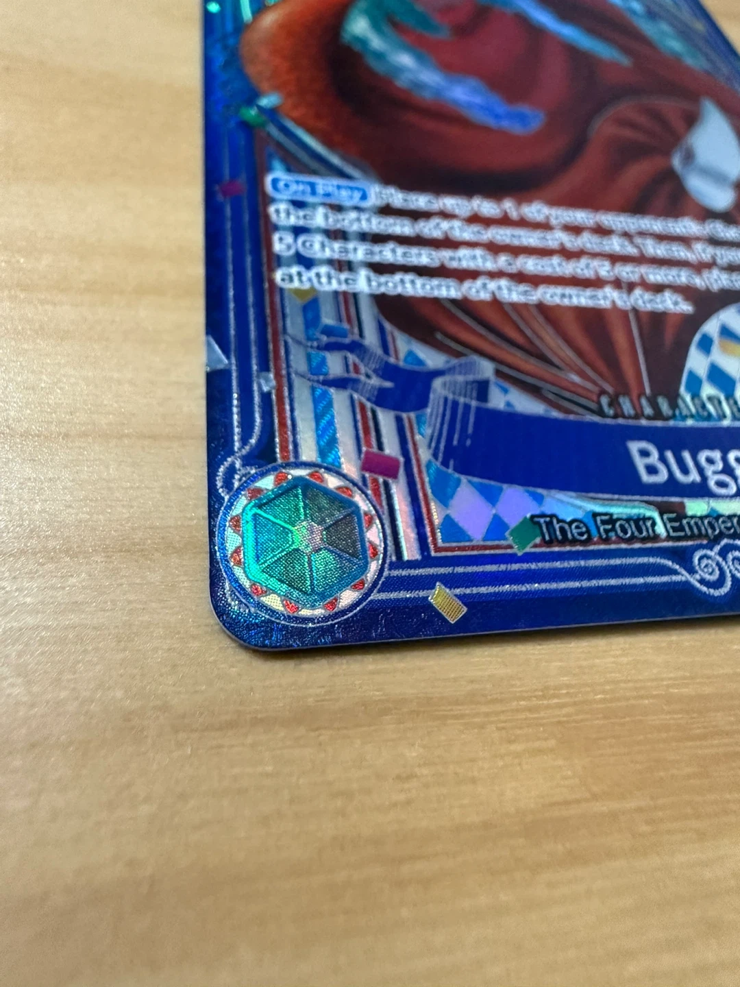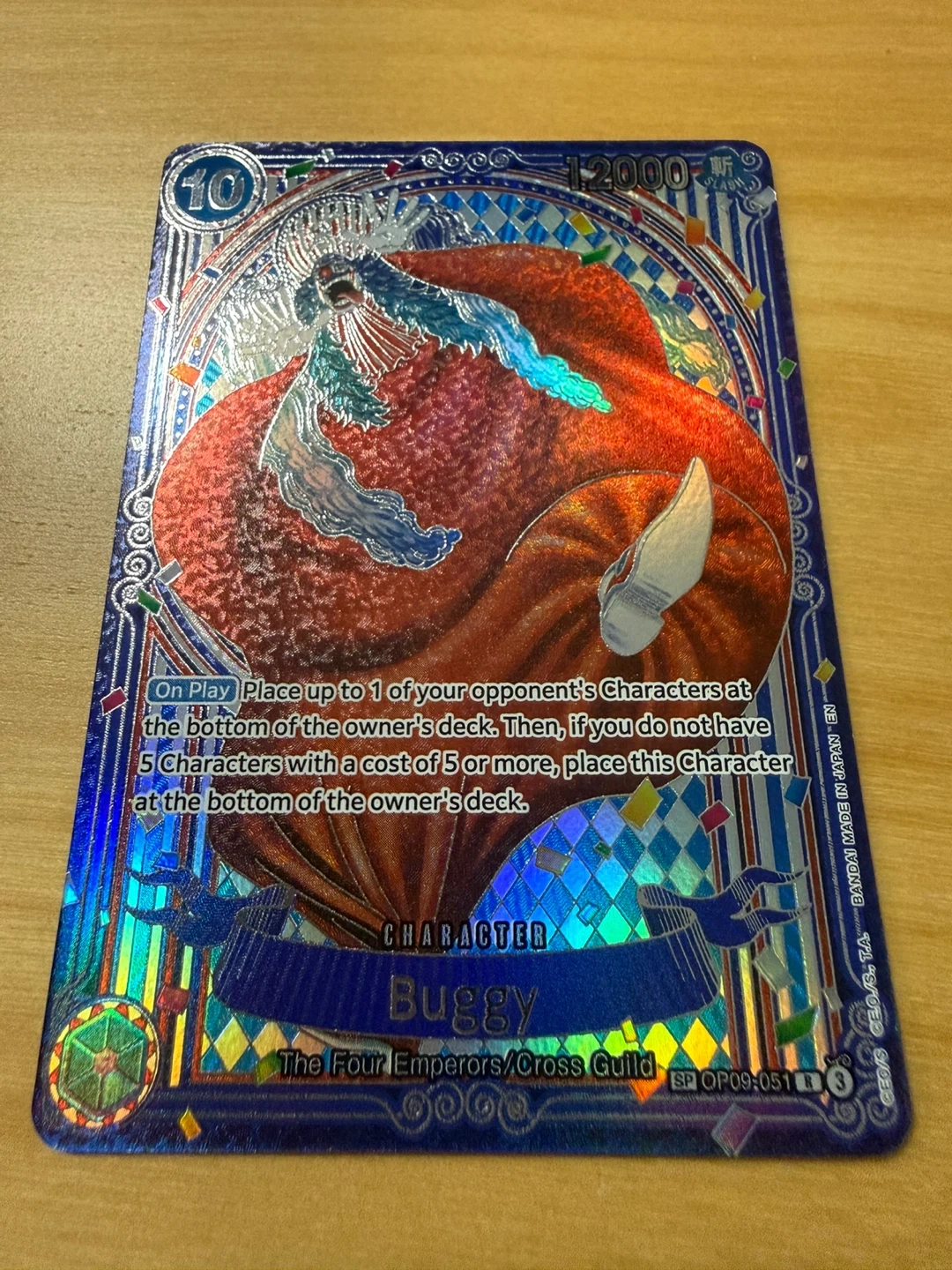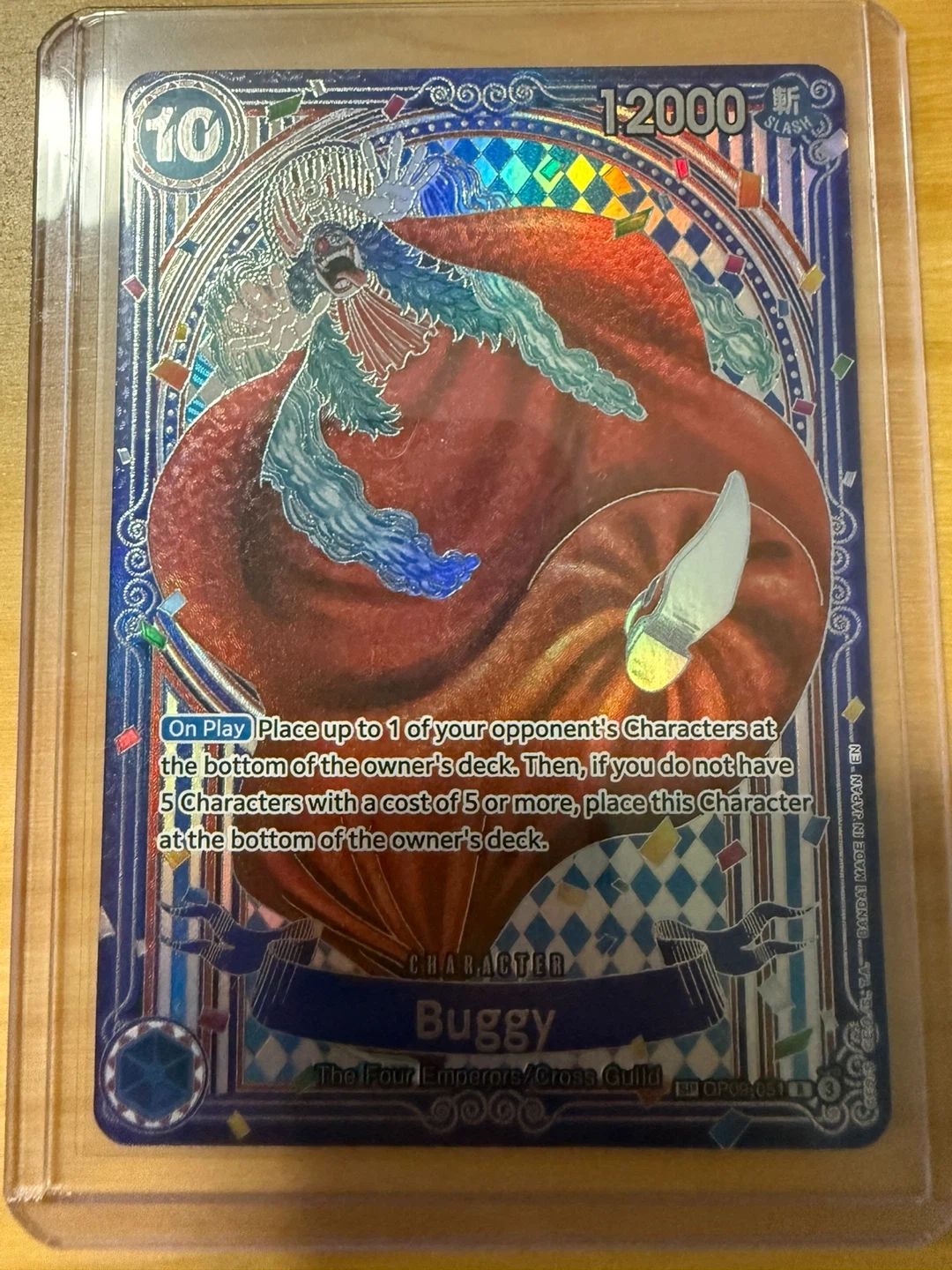 Mint condition, raw Buggy Silver SP card pulled from OP14 booster pack for One Piece Card Game placed in top loader.