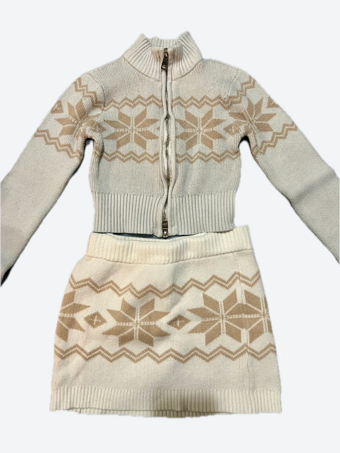 This Urban Heritage sweater and skirt set features a cozy fair isle knit pattern. It's a size extra small. Shows some signs of wear and slightly dimmer is shade. Perfect for staying warm during colder months!