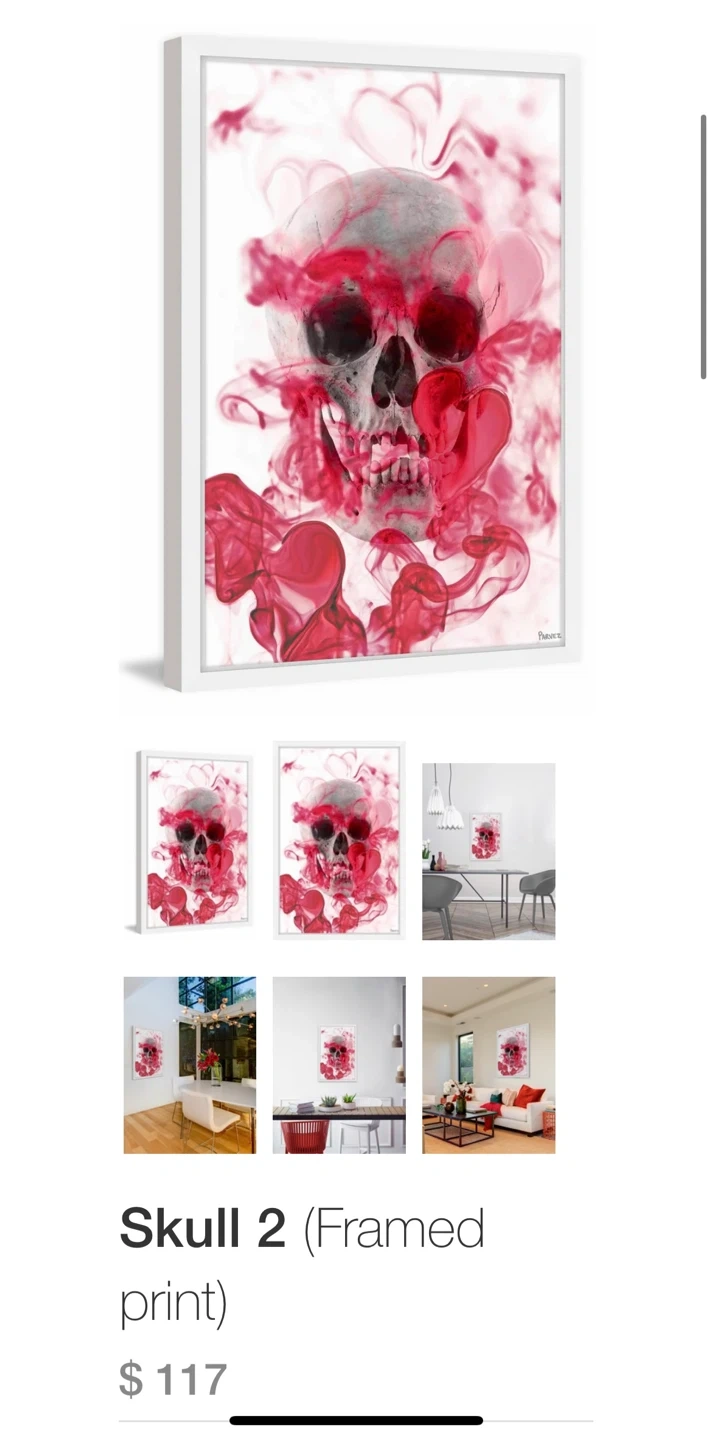 Framed print titled "Skull 2". Artwork by Parvez Taj, a visionary artist known for using UV inks on various substrates. This piece is custom artwork, manufactured by Parvez Michel, Inc. Printed directly on the mirror, transforming a classic accessory into a modern design element.