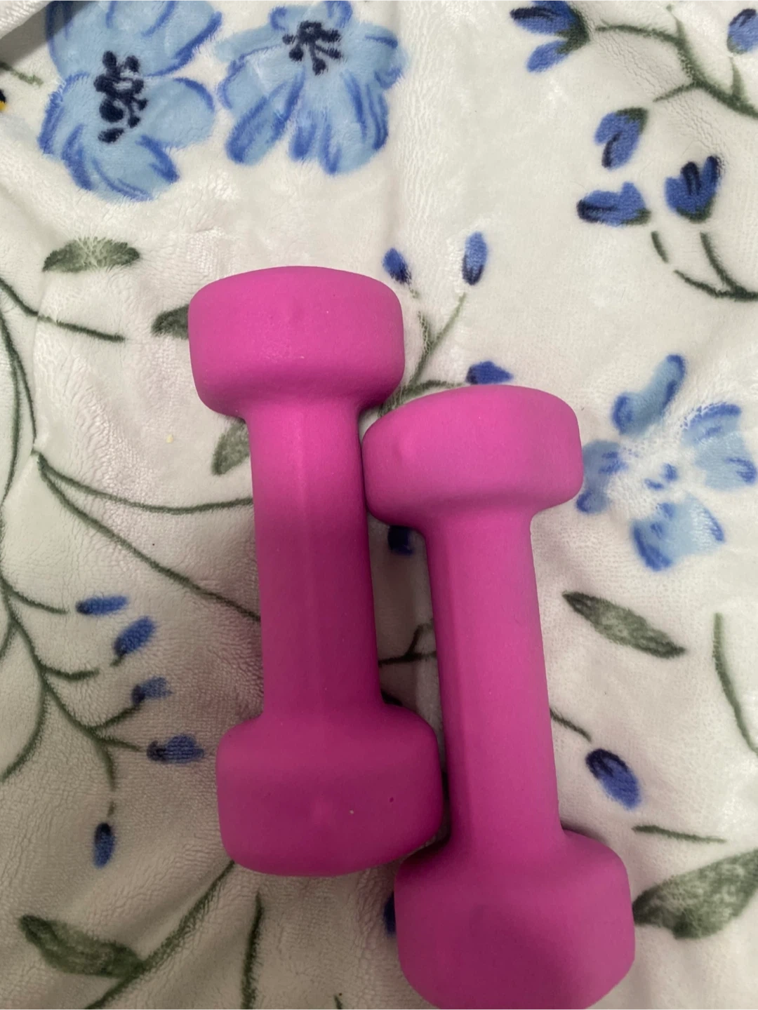 A pair of bright pink dumbbells. These are great for light workouts at home or in the gym. They're covered in a grippy material for a secure hold. Perfect for toning! Pick up cash only