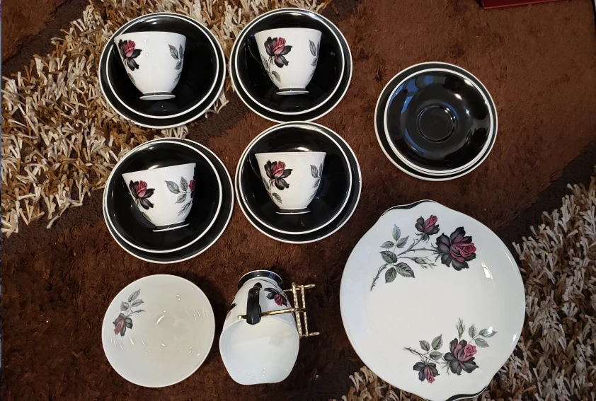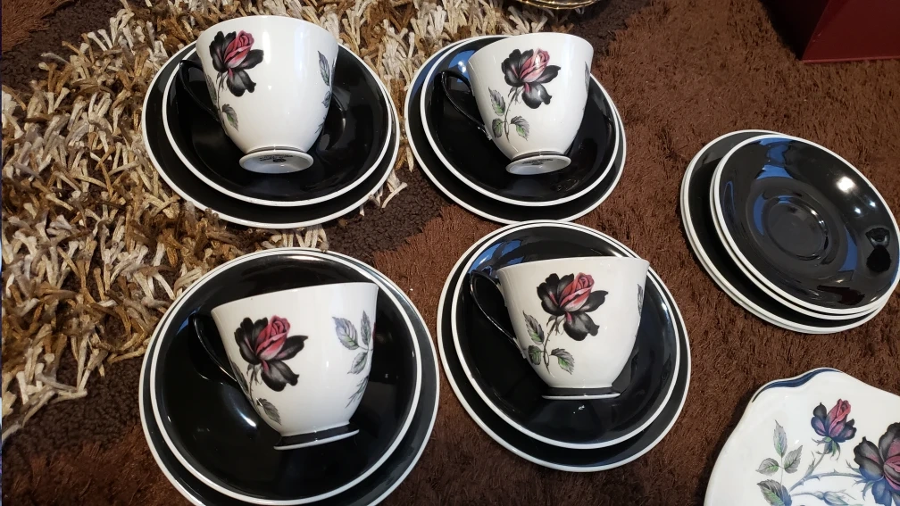 Elegant and beautiful 4 trio sets of Royal Albert's Masquerade, 1 cake plate, a big set of creamer and sugar and a few extra cake plates and saucers. Like new.