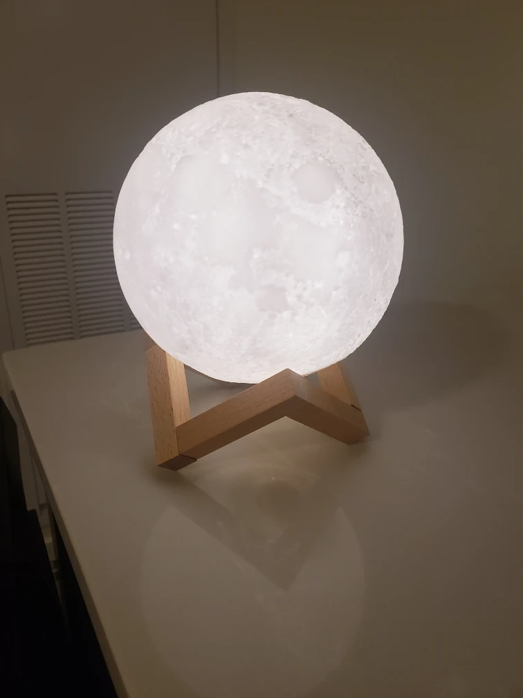 The moon has 3D realistic geographical characteristics, which you can see and feel. There are 3 lights (warm, white, and cool) which you can switch between by tapping the moon. It sits on a cute wooden base and is rechargeable with a USB Micro C cable (not included).
