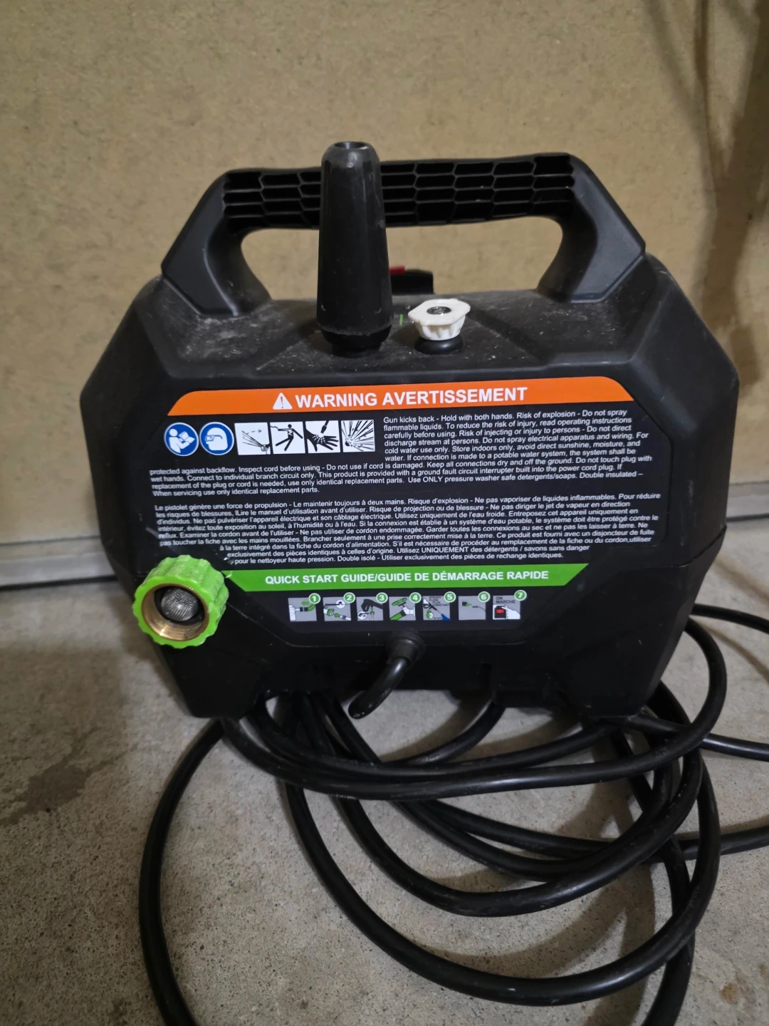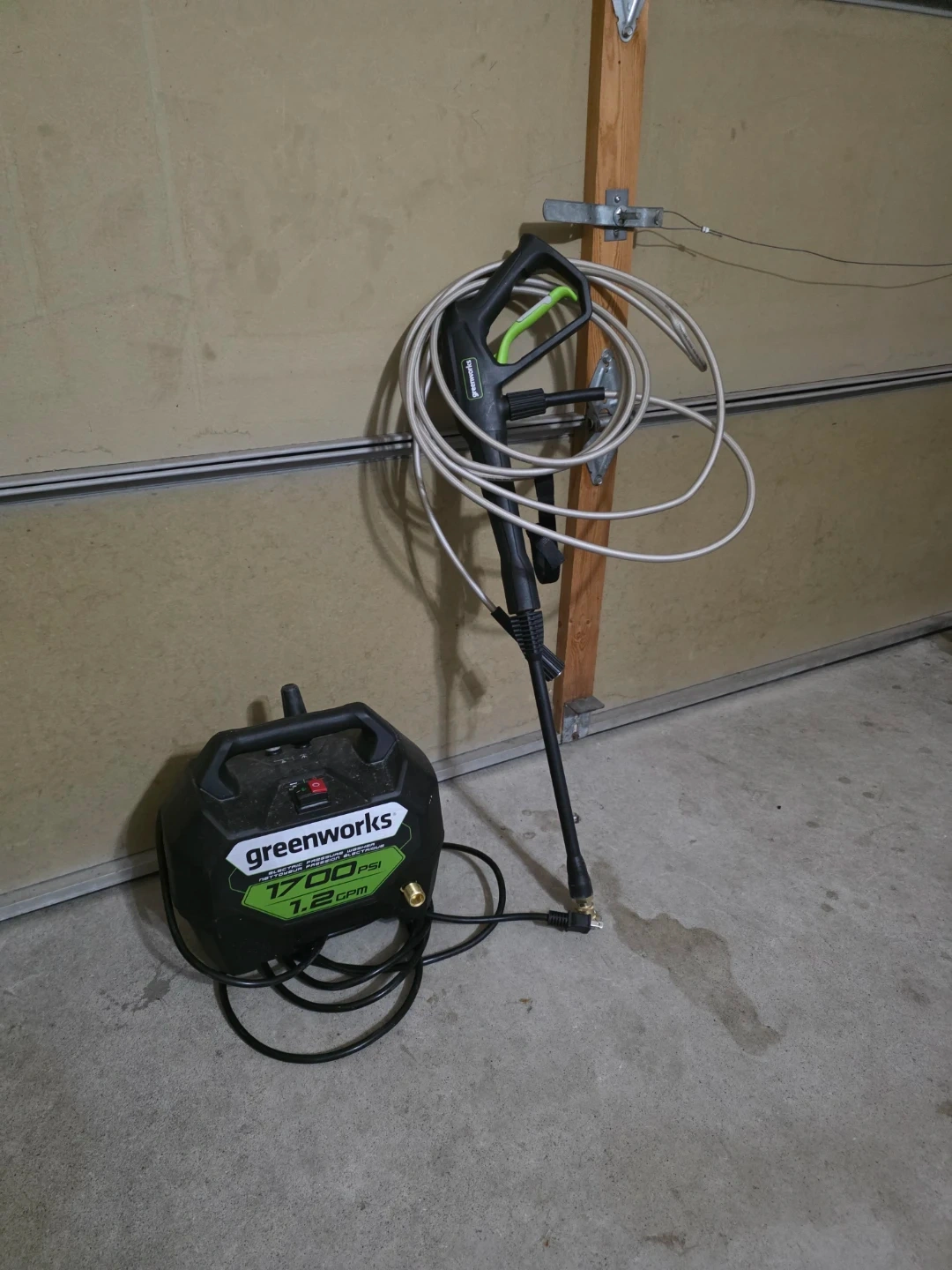 This is a Greenworks electric pressure washer with 1700 PSI and 1.2 GPM. It includes the main unit and the spray wand. Great for general cleaning tasks around the house!