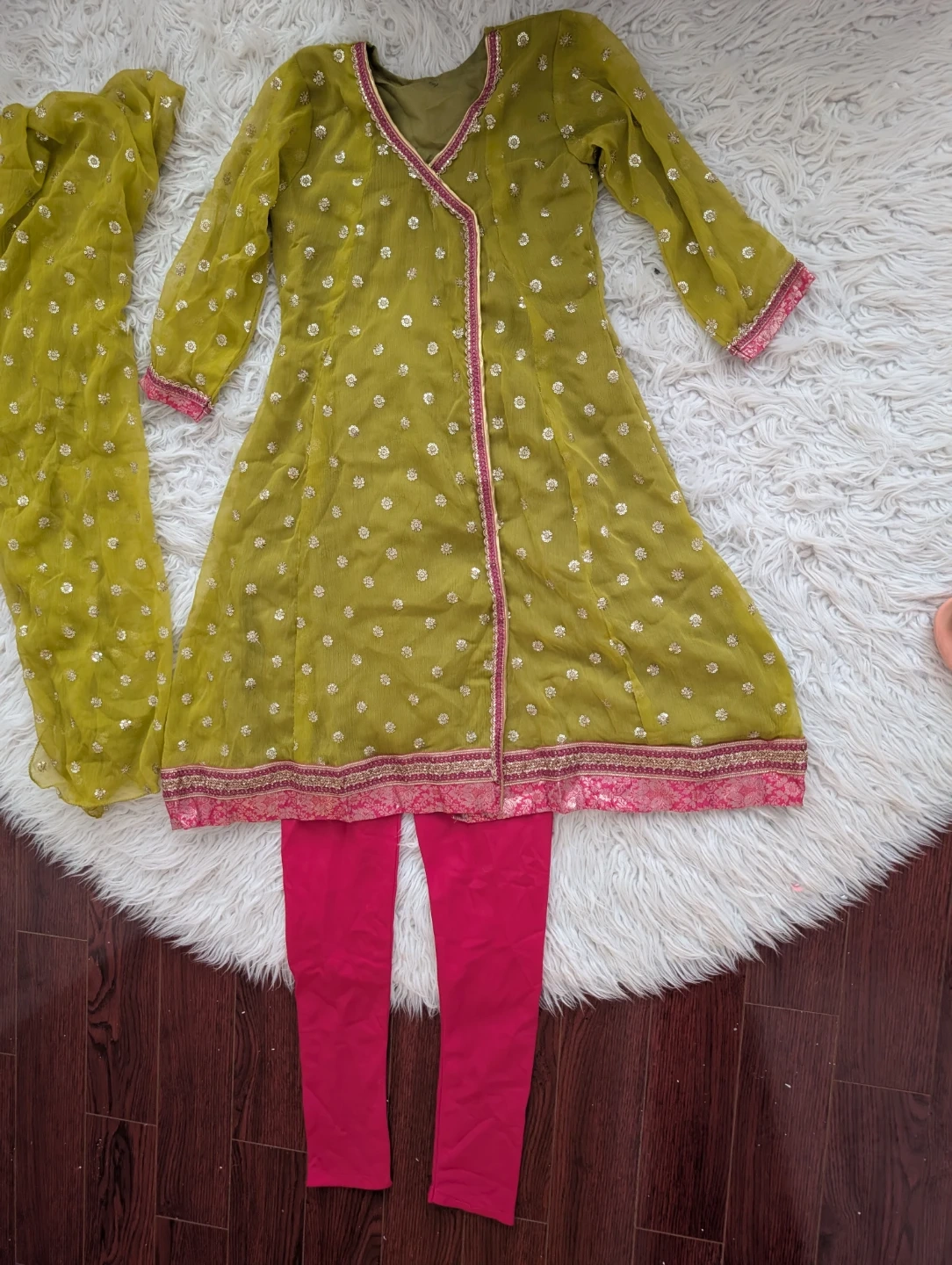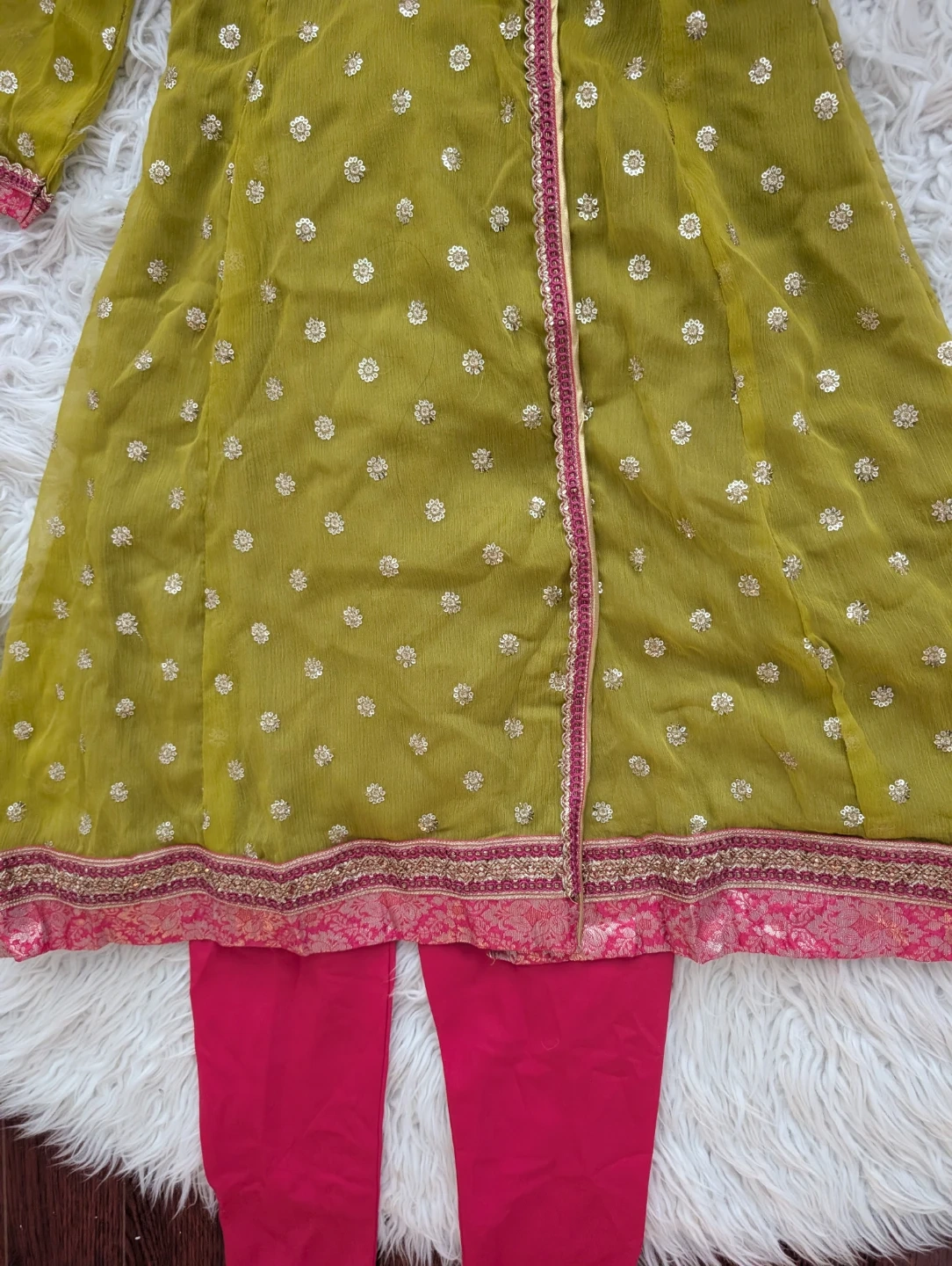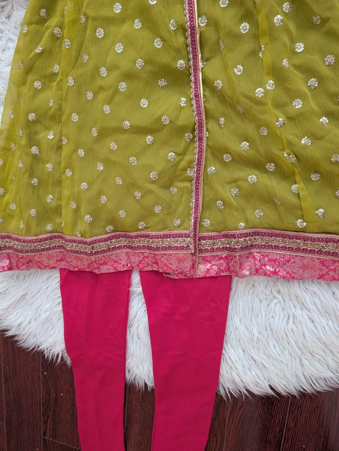 This is a lovely olive green kameez with delicate gold sequin work and pink trim. It comes with matching pink churidar. Perfect for festive occasions
